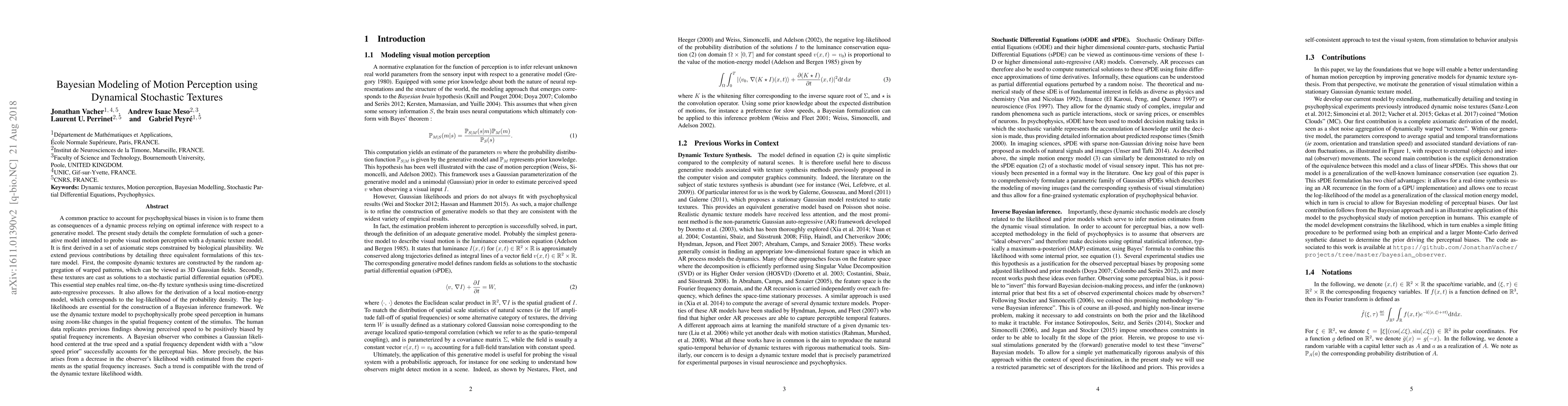 A common practice to account for psychophysical biases in vision is to frame them as consequences of a dynamic process relying on optimal inference with respect to a generative model. The present study details the complete formulation of such a generative model intended to probe visual motion perception with a dynamic texture model. It is first derived in a set of axiomatic steps constrained by biological plausibility. We extend previous contributions by detailing three equivalent formulations of this texture model. First, the composite dynamic textures are constructed by the random aggregation of warped patterns, which can be viewed as 3D Gaussian fields. Secondly, these textures are cast as solutions to a stochastic partial differential equation (sPDE). This essential step enables real time, on-the-fly texture synthesis using time-discretized auto-regressive processes. It also allows for the derivation of a local motion-energy model, which corresponds to the log-likelihood of the probability density. The log-likelihoods are essential for the construction of a Bayesian inference framework. We use the dynamic texture model to psychophysically probe speed perception in humans using zoom-like changes in the spatial frequency content of the stimulus. The human data replicates previous findings showing perceived speed to be positively biased by spatial frequency increments. A Bayesian observer who combines a Gaussian likelihood centered at the true speed and a spatial frequency dependent width with a "slow speed prior" successfully accounts for the perceptual bias. More precisely, the bias arises from a decrease in the observer's likelihood width estimated from the experiments as the spatial frequency increases. Such a trend is compatible with the trend of the dynamic texture likelihood width.