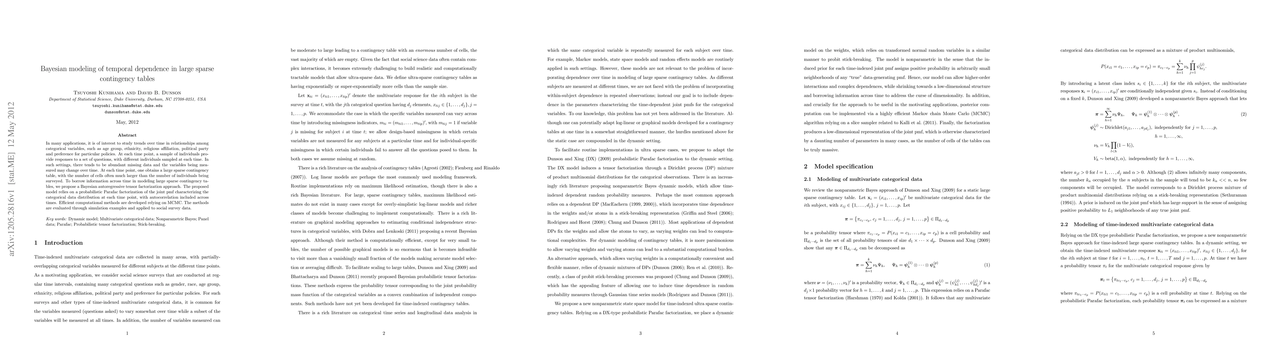 Researchers propose a Bayesian autoregressive tensor factorization approach to model temporal dependence in large sparse contingency tables, leveraging probabilistic Parafac factorization with autocorrelation across time points.