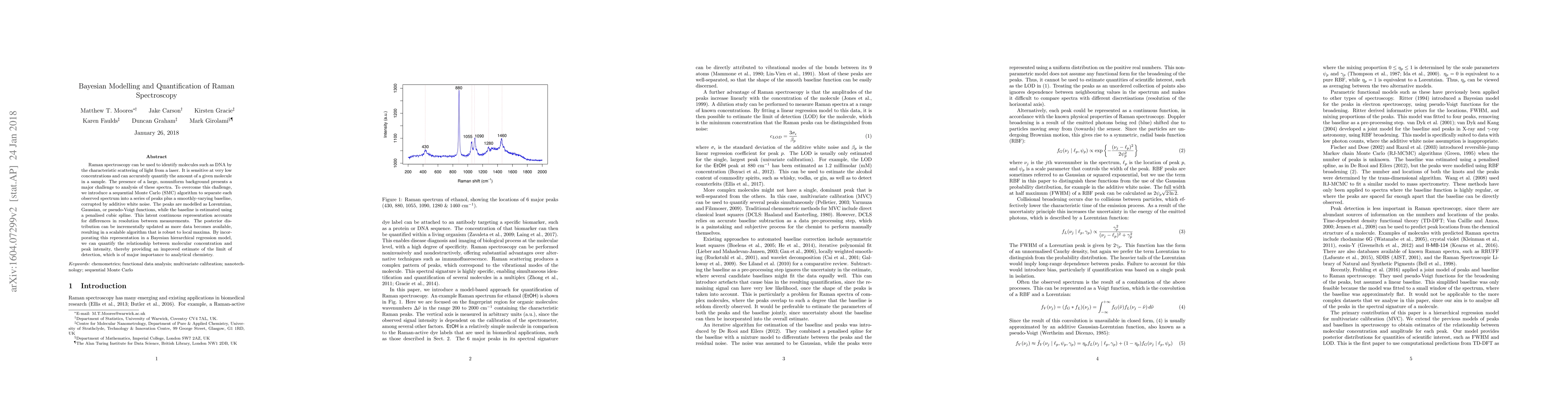 This paper introduces a Bayesian modelling approach using a sequential Monte Carlo (SMC) algorithm to analyze Raman spectroscopy data, addressing the challenge of nonuniform background noise. The method separates spectra into peaks and baselines, enabling accurate quantification of molecular concentrations at low levels, which is crucial for analytical chemistry.