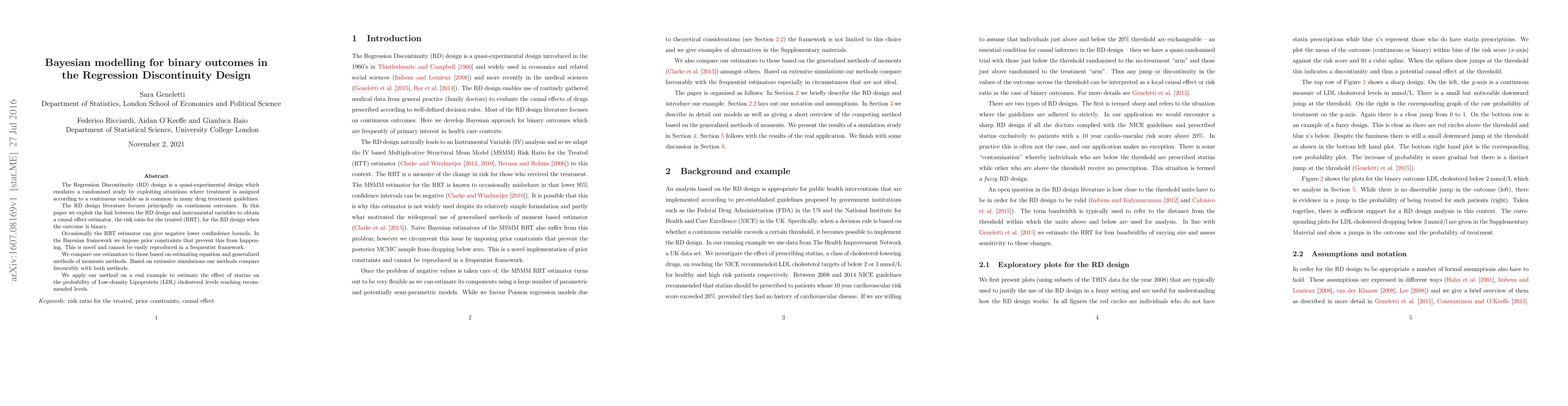 This paper develops Bayesian modelling for binary outcomes in the Regression Discontinuity design, proposing a risk ratio for the treated estimator that avoids negative lower confidence bounds. The Bayesian approach is shown to outperform frequentist estimators in simulations and is applied to estimate the effect of statins on LDL cholesterol levels.