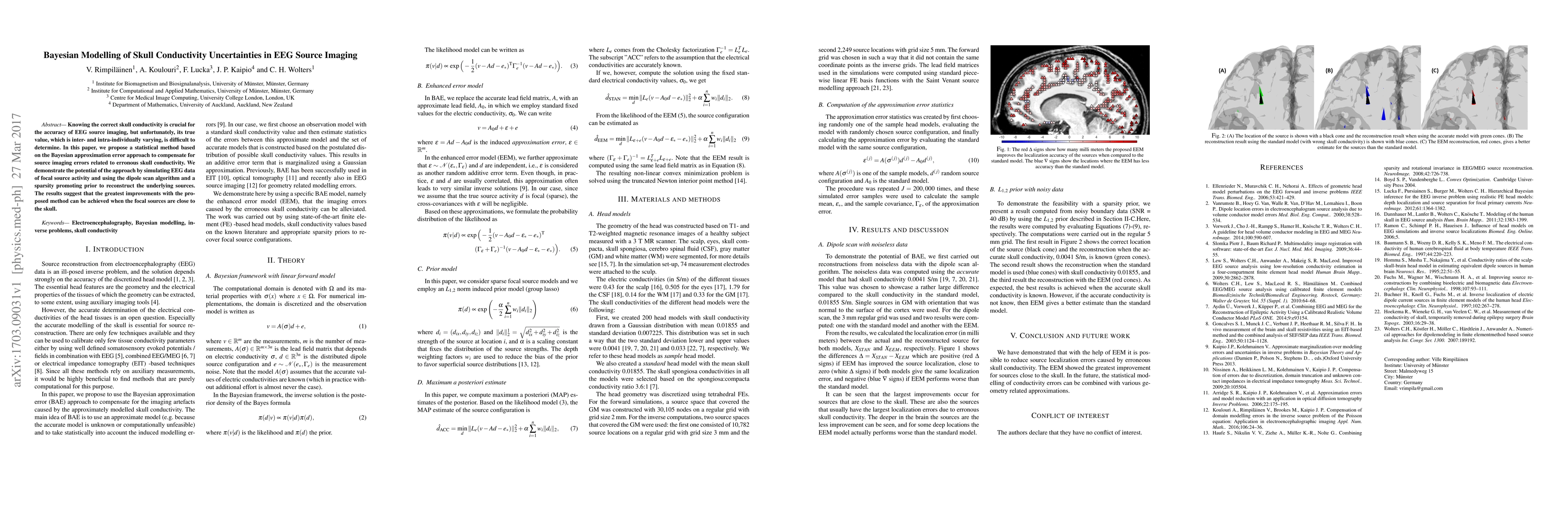 This paper proposes a Bayesian statistical method to address uncertainties in skull conductivity for EEG source imaging, aiming to improve accuracy. The method uses a Bayesian approximation error approach and demonstrates effectiveness through simulations, showing significant improvements when focal sources are near the skull.