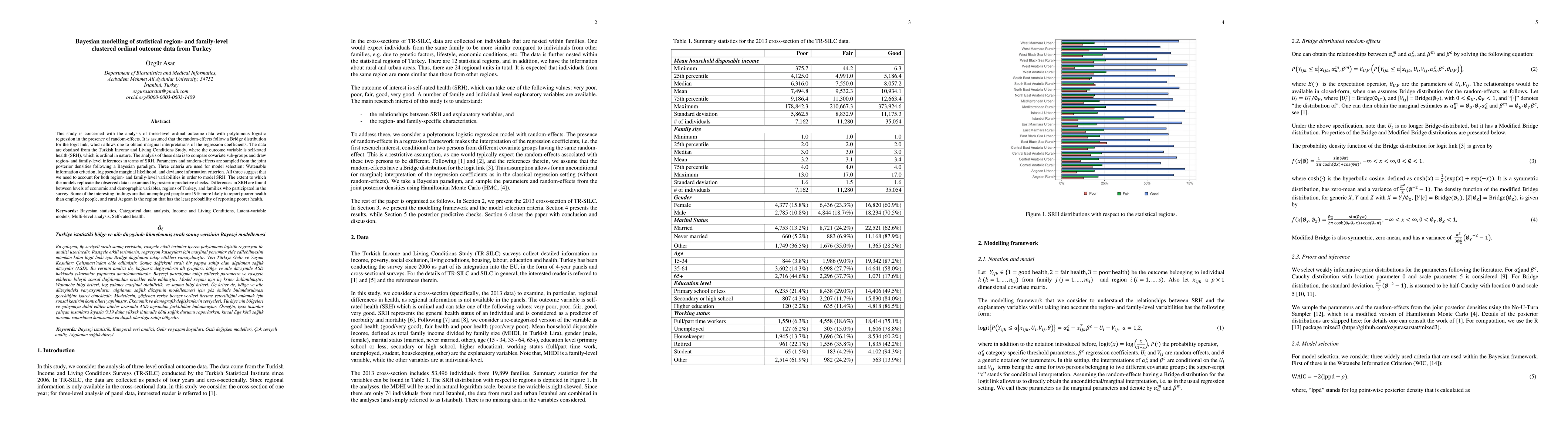 This study employs Bayesian modelling to analyze three-level ordinal outcome data from Turkey's Income and Living Conditions Study, focusing on self-rated health. The analysis reveals significant differences in health reporting across economic, demographic, regional, and family levels, highlighting the importance of accounting for both region- and family-level variabilities.