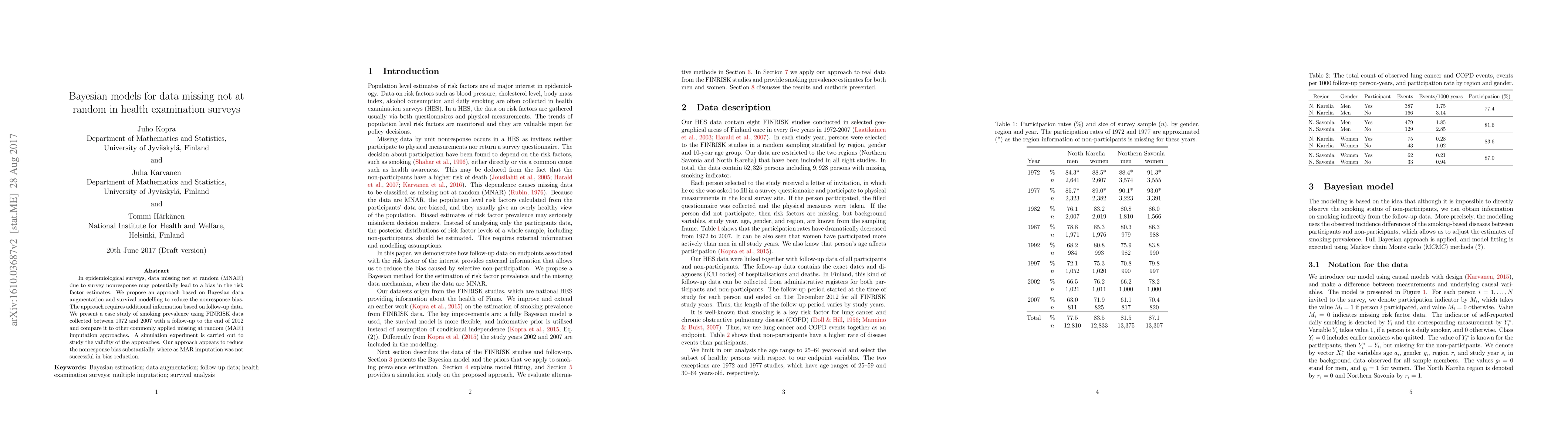 In epidemiological surveys, data missing not at random (MNAR) due to survey nonresponse may potentially lead to a bias in the risk factor estimates. We propose an approach based on Bayesian data augmentation and survival modelling to reduce the nonresponse bias. The approach requires additional information based on follow-up data. We present a case study of smoking prevalence using FINRISK data collected between 1972 and 2007 with a follow-up to the end of 2012 and compare it to other commonly applied missing at random (MAR) imputation approaches. A simulation experiment is carried out to study the validity of the approaches. Our approach appears to reduce the nonresponse bias substantially, where as MAR imputation was not successful in bias reduction.