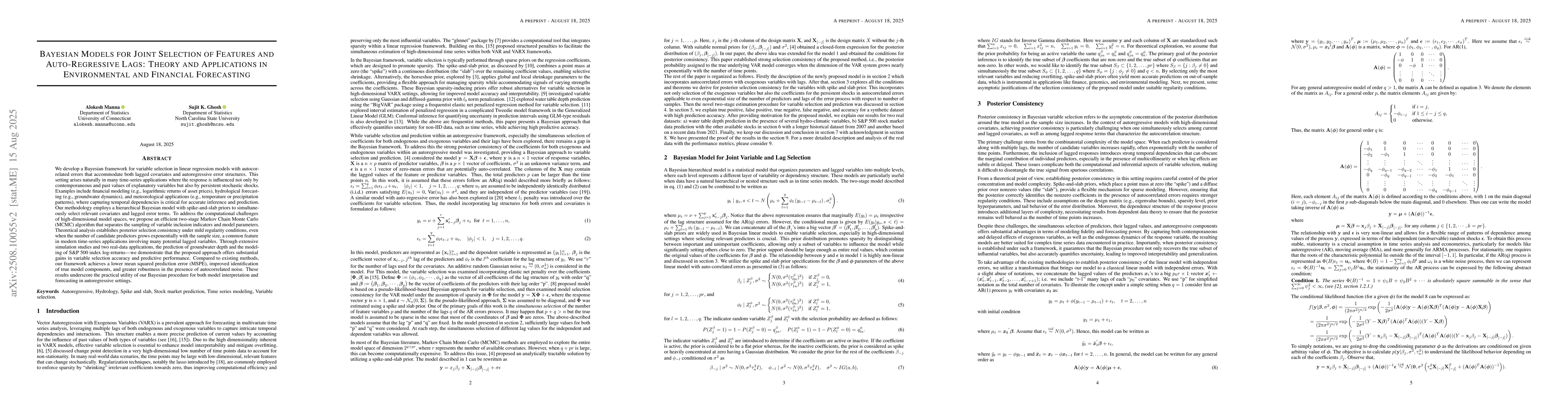 We develop a Bayesian framework for variable selection in linear regression with autocorrelated errors, accommodating lagged covariates and autoregressive structures. This setting occurs in time series applications where responses depend on contemporaneous or past explanatory variables and persistent stochastic shocks, including financial modeling, hydrological forecasting, and meteorological applications requiring temporal dependency capture. Our methodology uses hierarchical Bayesian models with spike-and-slab priors to simultaneously select relevant covariates and lagged error terms. We propose an efficient two-stage MCMC algorithm separating sampling of variable inclusion indicators and model parameters to address high-dimensional computational challenges. Theoretical analysis establishes posterior selection consistency under mild conditions, even when candidate predictors grow exponentially with sample size, common in modern time series with many potential lagged variables. Through simulations and real applications (groundwater depth prediction, S&P 500 log returns modeling), we demonstrate substantial gains in variable selection accuracy and predictive performance. Compared to existing methods, our framework achieves lower MSPE, improved true model component identification, and greater robustness with autocorrelated noise, underscoring practical utility for model interpretation and forecasting in autoregressive settings.