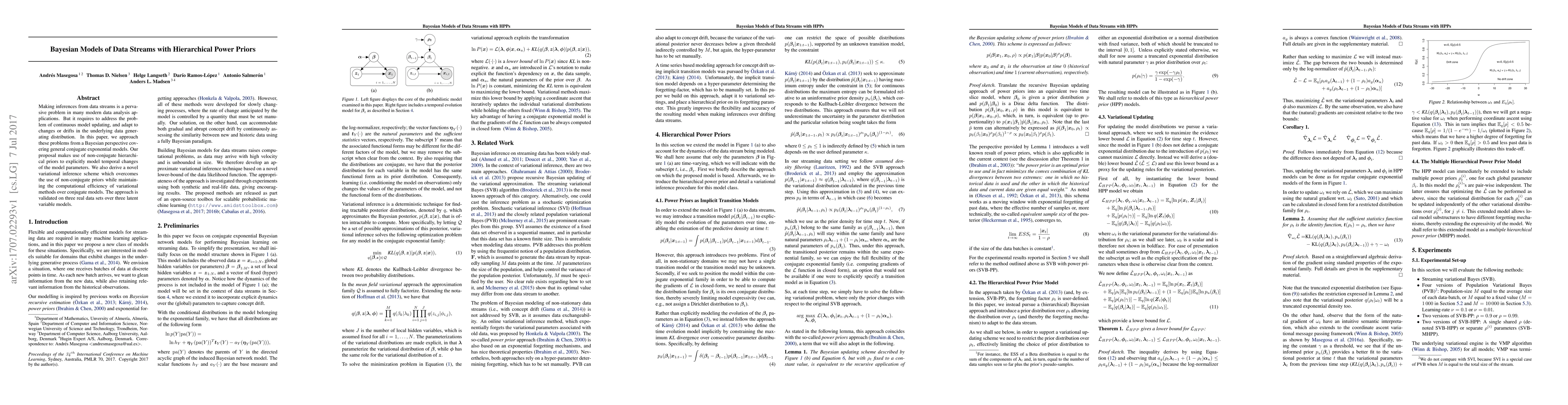 This paper proposes Bayesian models for data streams using hierarchical power priors to handle continuous model updating and adapt to changes in the data distribution. It introduces a novel variational inference scheme to manage non-conjugate priors efficiently and validates the approach through real-world data sets.