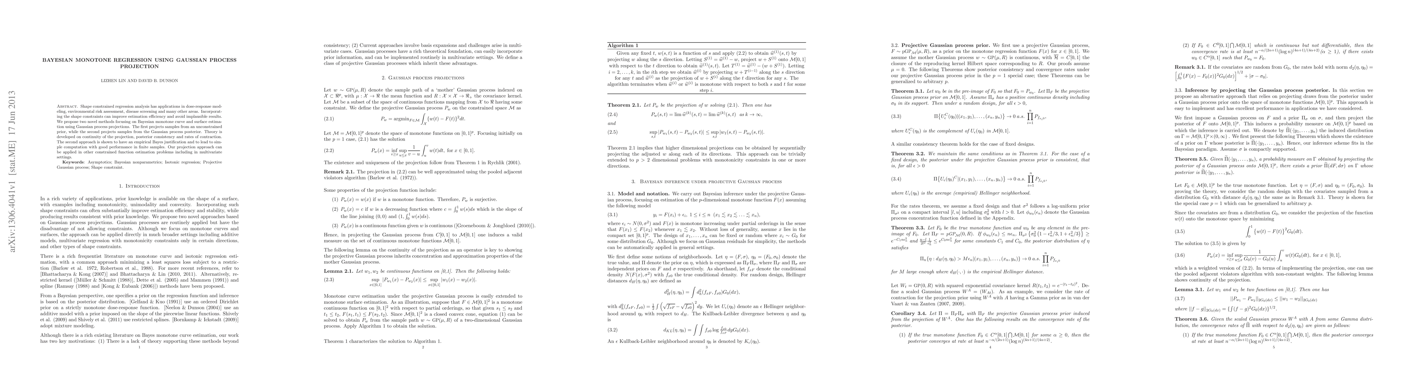 This paper proposes two Bayesian methods for monotone curve and surface estimation using Gaussian process projections, focusing on shape-constrained regression. The second method, which projects samples from the Gaussian process posterior, demonstrates empirical Bayes justification and effective performance in finite samples.