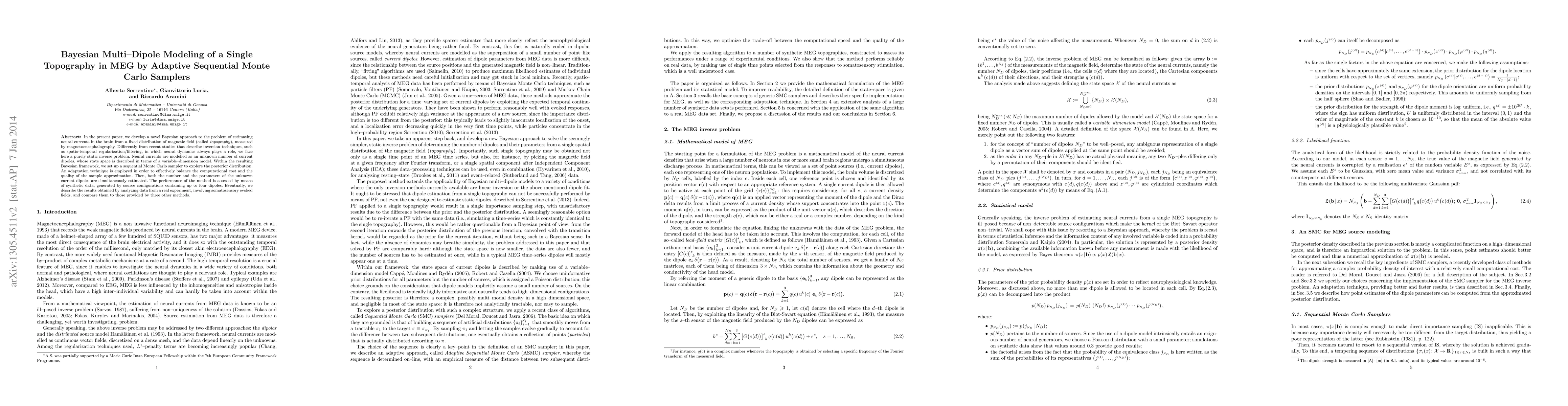 In the present paper, we develop a novel Bayesian approach to the problem of estimating neural currents in the brain from a fixed distribution of magnetic field (called \emph{topography}), measured by magnetoencephalography. Differently from recent studies that describe inversion techniques, such as spatio-temporal regularization/filtering, in which neural dynamics always plays a role, we face here a purely static inverse problem. Neural currents are modelled as an unknown number of current dipoles, whose state space is described in terms of a variable--dimension model. Within the resulting Bayesian framework, we set up a sequential Monte Carlo sampler to explore the posterior distribution. An adaptation technique is employed in order to effectively balance the computational cost and the quality of the sample approximation. Then, both the number and the parameters of the unknown current dipoles are simultaneously estimated. The performance of the method is assessed by means of synthetic data, generated by source configurations containing up to four dipoles. Eventually, we describe the results obtained by analyzing data from a real experiment, involving somatosensory evoked fields, and compare them to those provided by three other methods.