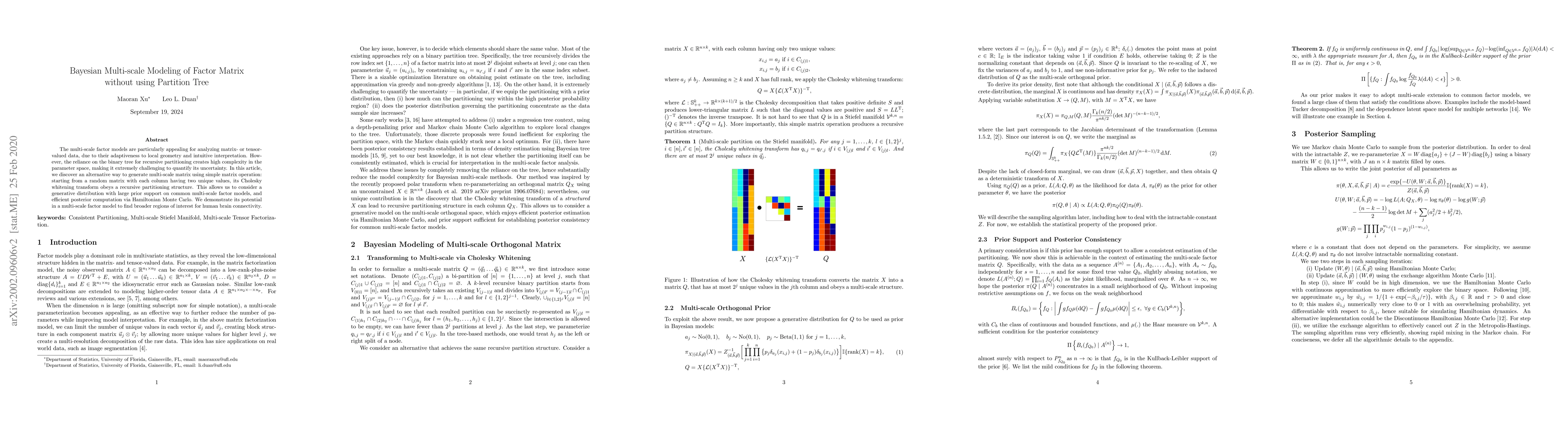 The multi-scale factor models are particularly appealing for analyzing matrix- or tensor-valued data, due to their adaptiveness to local geometry and intuitive interpretation. However, the reliance on the binary tree for recursive partitioning creates high complexity in the parameter space, making it extremely challenging to quantify its uncertainty. In this article, we discover an alternative way to generate multi-scale matrix using simple matrix operation: starting from a random matrix with each column having two unique values, its Cholesky whitening transform obeys a recursive partitioning structure. This allows us to consider a generative distribution with large prior support on common multi-scale factor models, and efficient posterior computation via Hamiltonian Monte Carlo. We demonstrate its potential in a multi-scale factor model to find broader regions of interest for human brain connectivity.