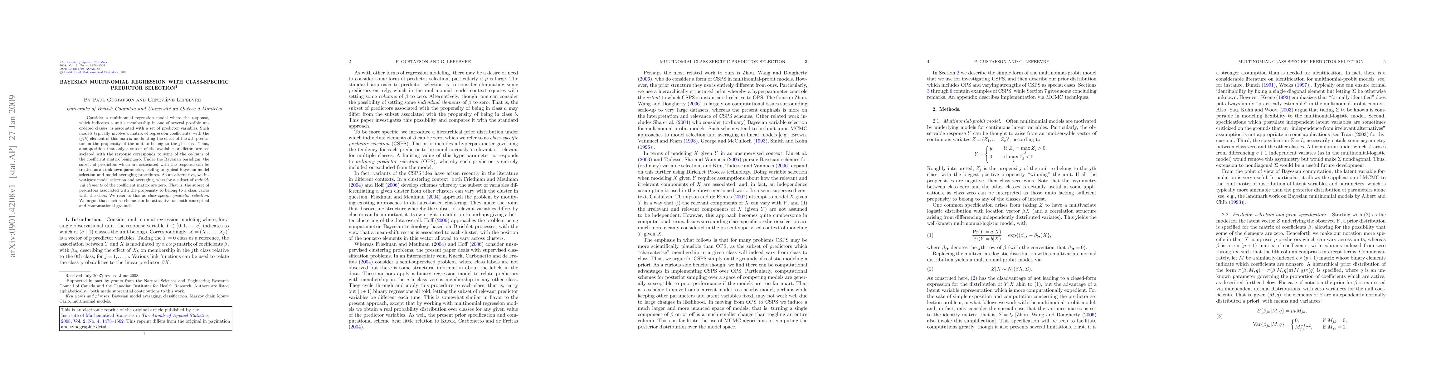 This paper proposes a Bayesian multinomial regression model with class-specific predictor selection, where the effect of predictors varies by class. It aims to identify which predictors influence the propensity of units to belong to different classes, enhancing both conceptual clarity and computational efficiency.