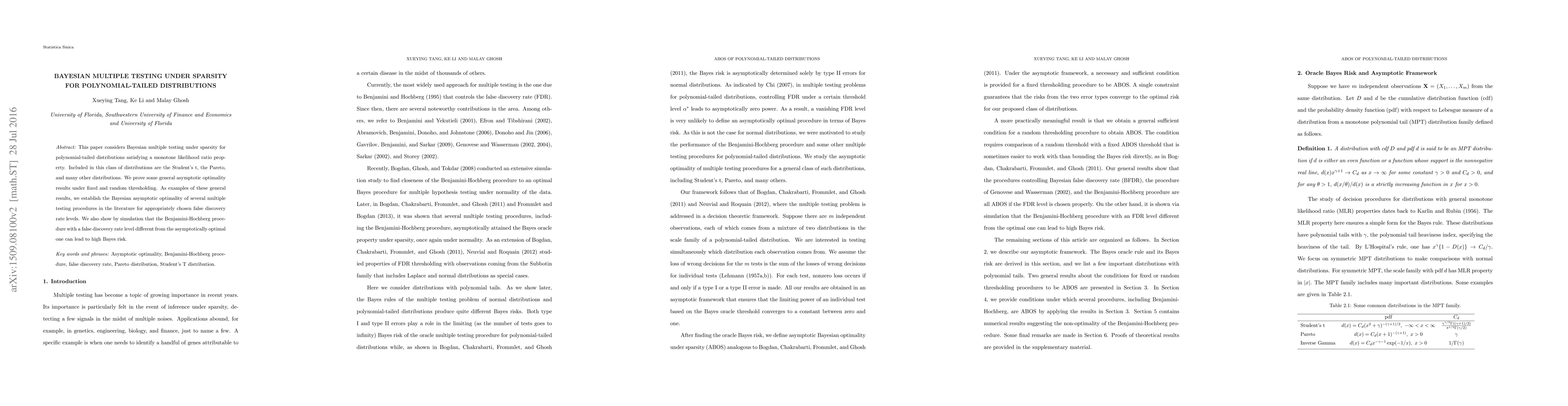 This paper explores Bayesian multiple testing under sparsity for polynomial-tailed distributions, proving asymptotic optimality results for various procedures and demonstrating via simulation that deviating from the optimal false discovery rate can significantly increase Bayes risk.