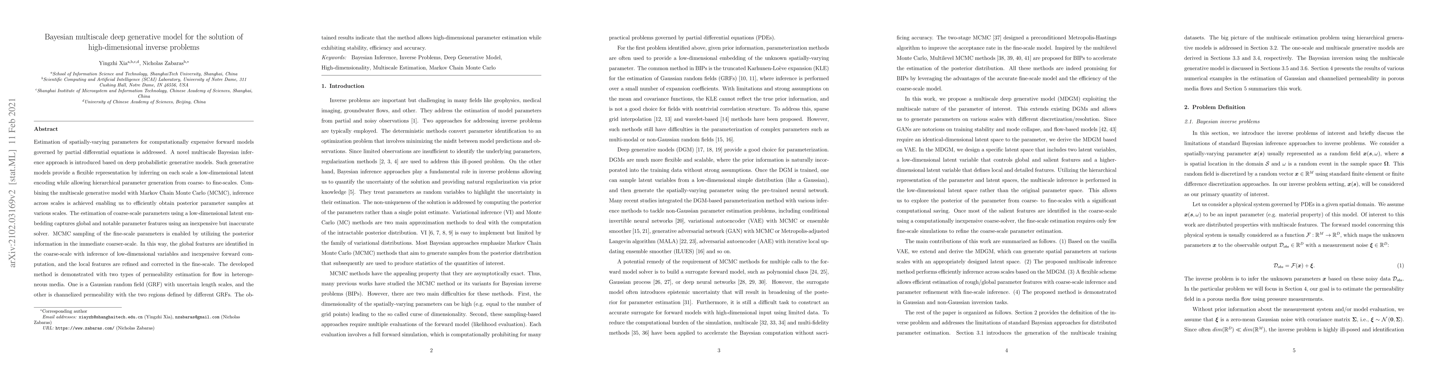 This paper introduces a multiscale Bayesian inference approach using deep generative models to solve high-dimensional inverse problems for computationally expensive forward models. The method efficiently combines low-dimensional latent encodings with Markov Chain Monte Carlo sampling to capture global and local parameter features, demonstrating stability, efficiency, and accuracy in permeability estimation for flow in heterogeneous media.