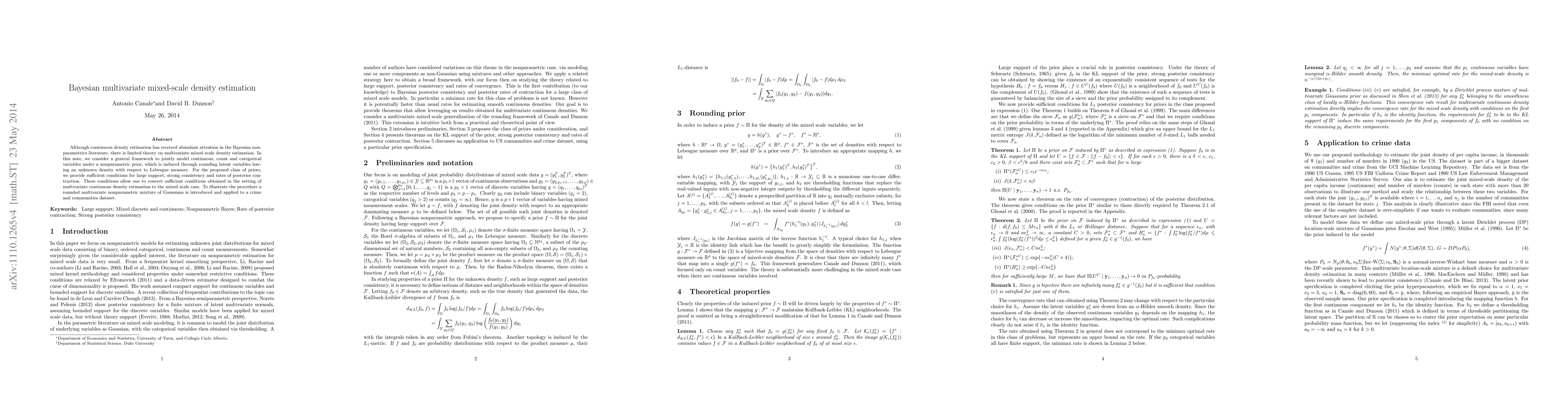This paper proposes a Bayesian nonparametric framework for multivariate mixed-scale density estimation, integrating continuous, count, and categorical variables. It provides conditions for large support, strong consistency, and posterior contraction rates, and demonstrates an application using a rounded multivariate nonparametric mixture of Gaussians on a crime and communities dataset.