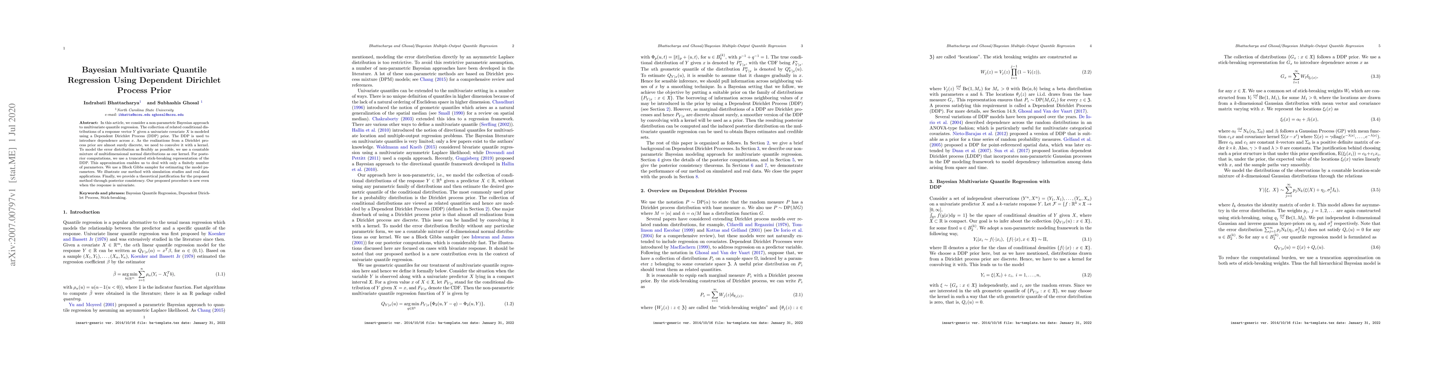 This paper proposes a non-parametric Bayesian multivariate quantile regression method using a Dependent Dirichlet Process prior to model dependence across covariates. It employs a mixture of multidimensional normal distributions to flexibly model the error distribution and uses a truncated stick-breaking representation for posterior computations, validated through simulation and real data applications.