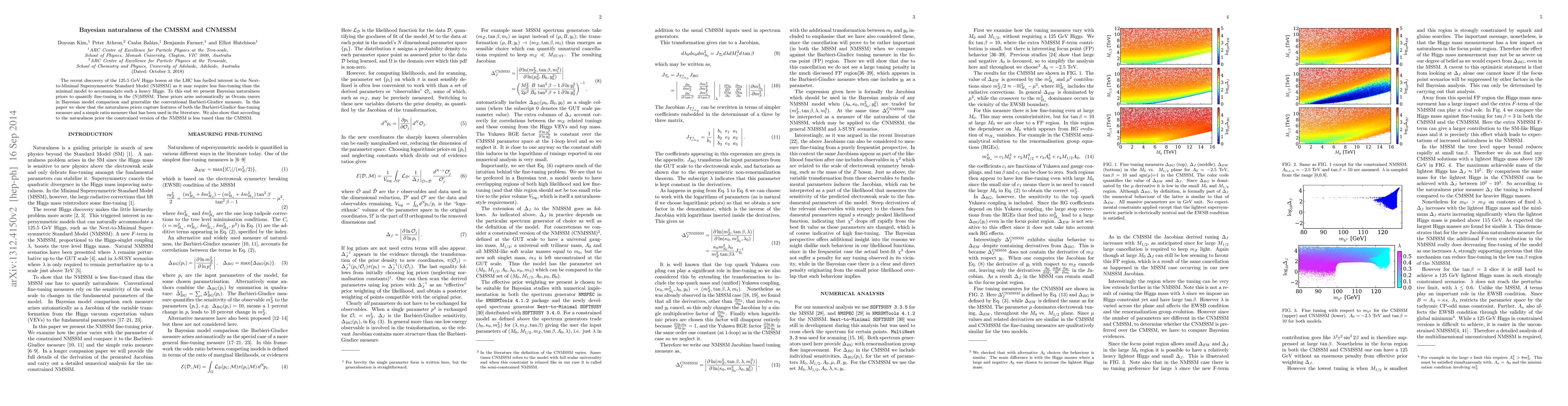 This paper introduces Bayesian naturalness priors to quantify fine-tuning in the CMSSM and CNMSSM, showing that the constrained NMSSM requires less fine-tuning than the CMSSM to accommodate a 125.5 GeV Higgs boson. These priors generalize the Barbieri-Giudice measure and capture features from both conventional fine-tuning measures and simple ratio measures.