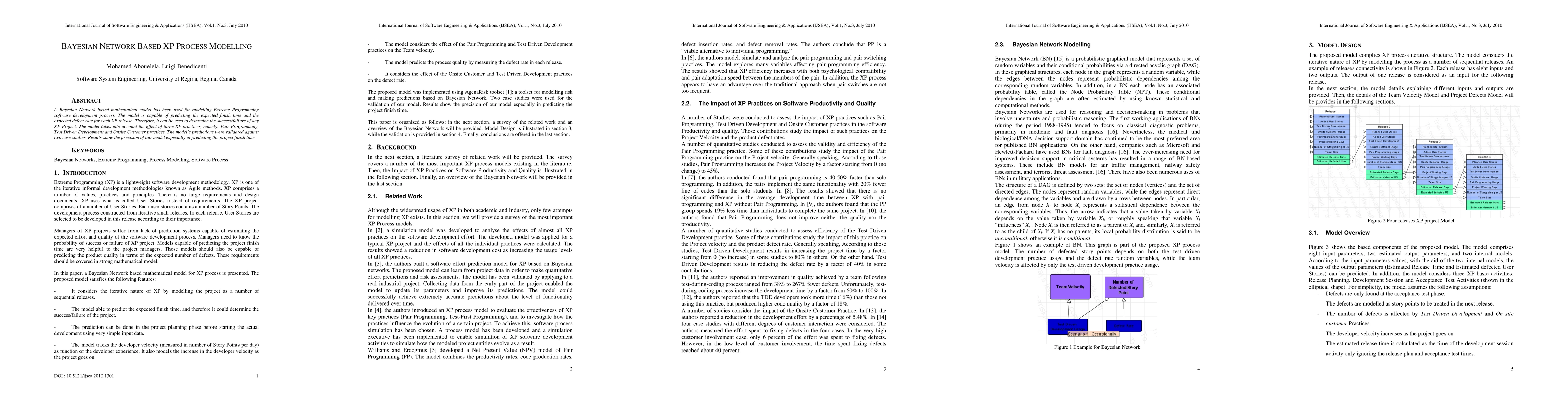 This research introduces a Bayesian Network model to forecast finish time and defect rates in Extreme Programming (XP) software development, considering practices like Pair Programming, Test Driven Development, and Onsite Customer. Validation through case studies demonstrates its accuracy, particularly in predicting project completion.