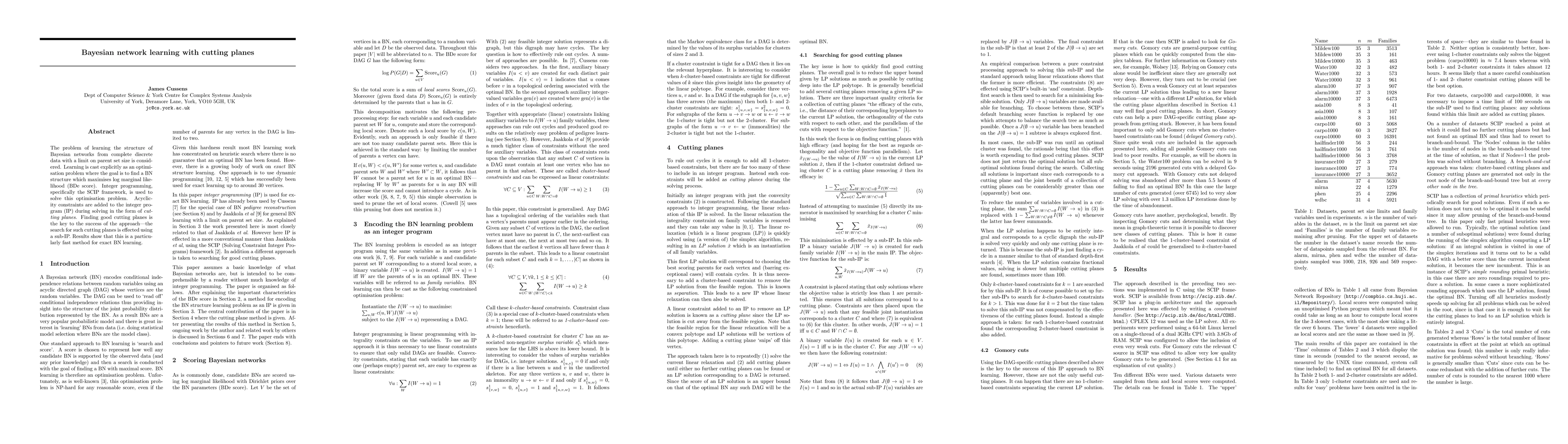 This paper proposes an optimization-based approach for learning Bayesian network structures from complete discrete data, using integer programming and cutting planes to enforce acyclicity. The method employs a sub-integer program to identify effective cutting planes, demonstrating significant speed in exact Bayesian network learning.
