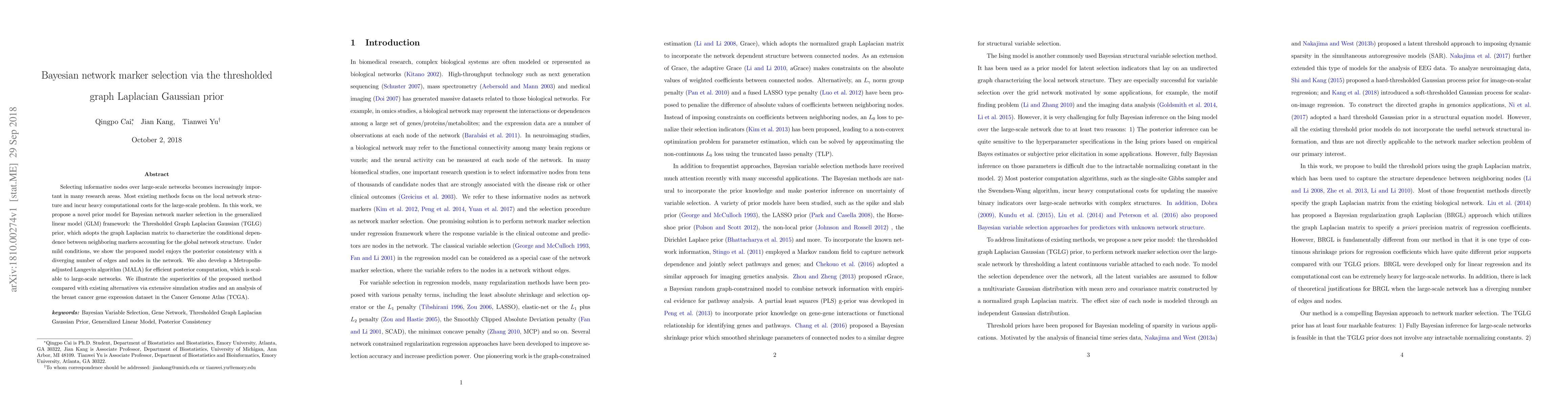 This paper proposes a novel Bayesian network marker selection method using the Thresholded Graph Laplacian Gaussian (TGLG) prior to efficiently identify informative nodes in large-scale networks. The method leverages the global network structure and demonstrates posterior consistency, employing a scalable Metropolis-adjusted Langevin algorithm for efficient computation.