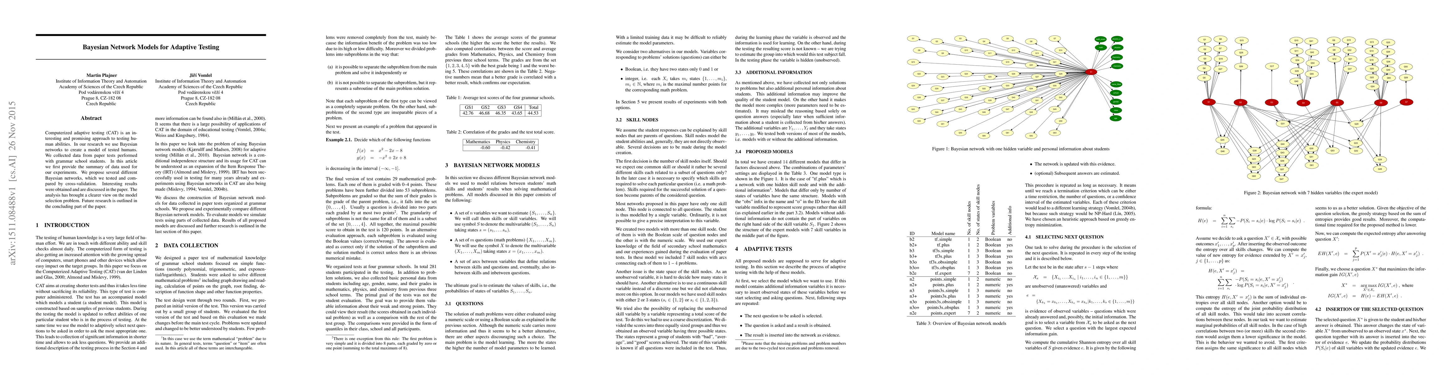 Computerized adaptive testing (CAT) is an interesting and promising approach to testing human abilities. In our research we use Bayesian networks to create a model of tested humans. We collected data from paper tests performed with grammar school students. In this article we first provide the summary of data used for our experiments. We propose several different Bayesian networks, which we tested and compared by cross-validation. Interesting results were obtained and are discussed in the paper. The analysis has brought a clearer view on the model selection problem. Future research is outlined in the concluding part of the paper.
