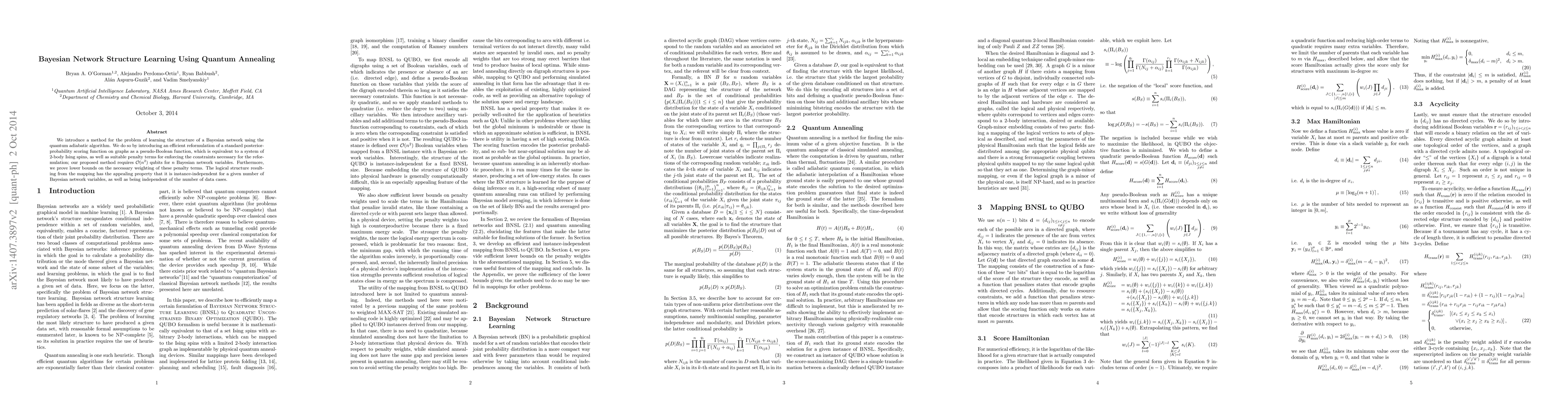 We introduce a method for the problem of learning the structure of a Bayesian network using the quantum adiabatic algorithm. We do so by introducing an efficient reformulation of a standard posterior-probability scoring function on graphs as a pseudo-Boolean function, which is equivalent to a system of 2-body Ising spins, as well as suitable penalty terms for enforcing the constraints necessary for the reformulation; our proposed method requires $\mathcal O(n^2)$ qubits for $n$ Bayesian network variables. Furthermore, we prove lower bounds on the necessary weighting of these penalty terms. The logical structure resulting from the mapping has the appealing property that it is instance-independent for a given number of Bayesian network variables, as well as being independent of the number of data cases.