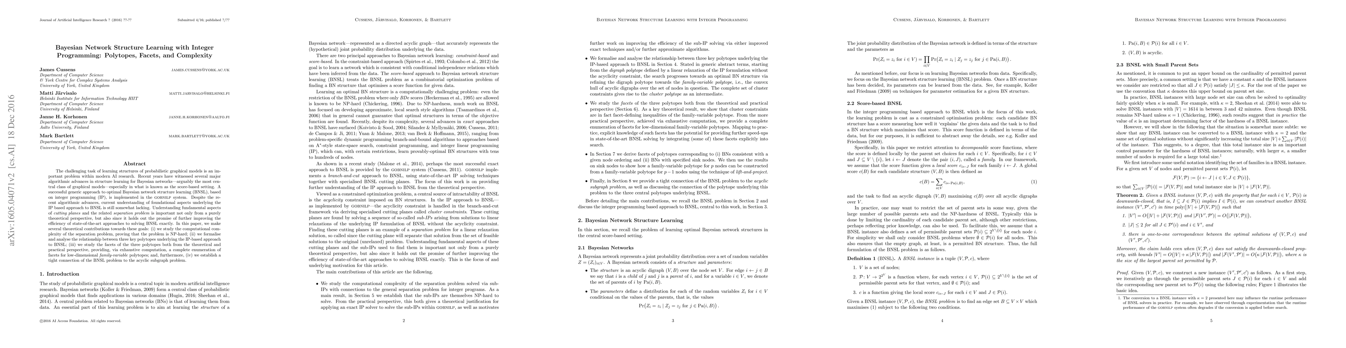 This research paper addresses the complexity of learning Bayesian network structures using integer programming, proving it is NP-hard and establishing a connection to the acyclic subgraph problem.