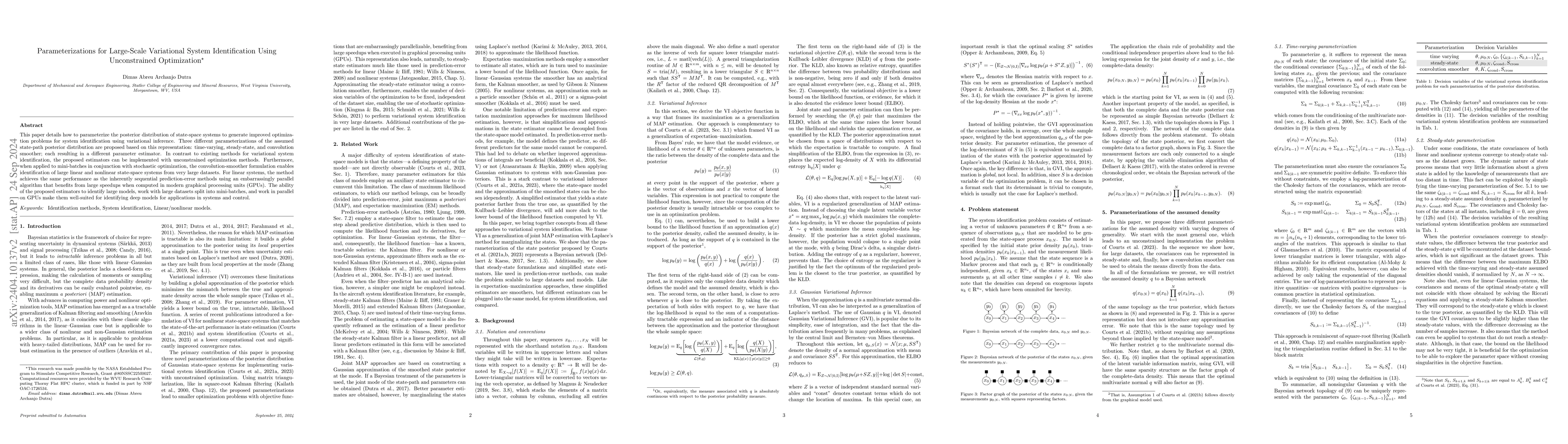 This paper details how the Bayesian-network structure of the posterior distribution of state-space models can be exploited to build improved parameterizations for system identification using variational inference. Three different parameterizations of the assumed state-path posterior distribution are proposed based on this representation: time-varying, steady-state, and convolution-smoother; each resulting in a different parameter estimation method. In contrast to existing methods for variational system identification, the proposed estimators can be implemented with unconstrained optimization methods. Furthermore, when applied to mini-batches in conjunction with stochastic optimization methods, the convolution-smoother formulation enables identification of large linear and nonlinear state-space systems from very large datasets. For linear systems, the method achieves the same performance as the inherently sequential prediction-error methods using and embarrassingly parallel algorithm that benefits from large speedups when computed in modern graphical processing units (GPUs). The ability of the proposed estimators to identify large models, work with large datasets split into mini-batches, and be work in parallel on GPUs make them well-suited for identifying deep models for applications in systems and control.