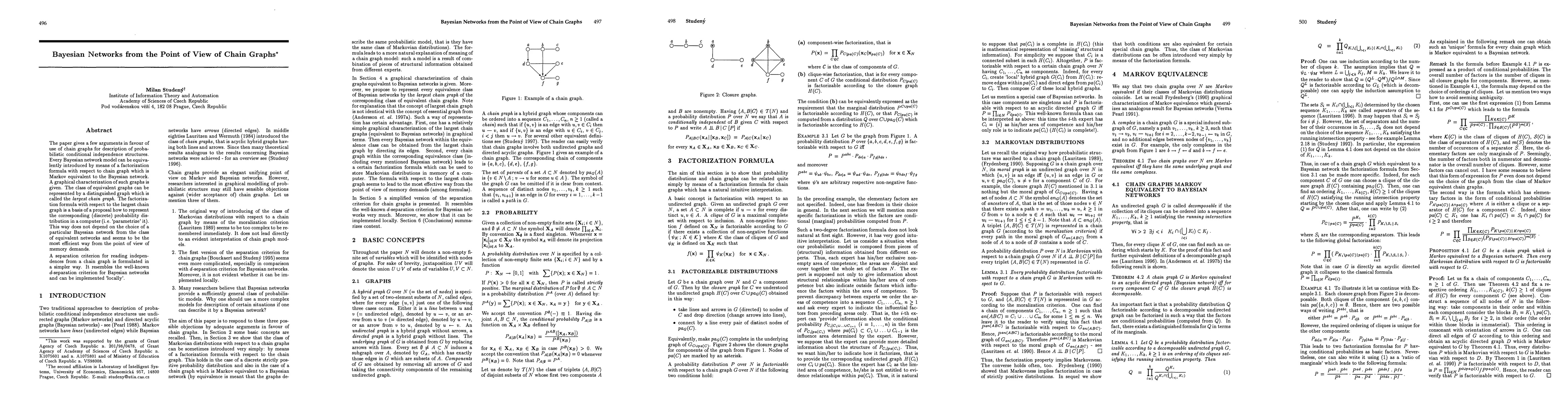 AThe paper gives a few arguments in favour of the use of chain graphs for description of probabilistic conditional independence structures. Every Bayesian network model can be equivalently introduced by means of a factorization formula with respect to a chain graph which is Markov equivalent to the Bayesian network. A graphical characterization of such graphs is given. The class of equivalent graphs can be represented by a distinguished graph which is called the largest chain graph. The factorization formula with respect to the largest chain graph is a basis of a proposal of how to represent the corresponding (discrete) probability distribution in a computer (i.e. parametrize it). This way does not depend on the choice of a particular Bayesian network from the class of equivalent networks and seems to be the most efficient way from the point of view of memory demands. A separation criterion for reading independency statements from a chain graph is formulated in a simpler way. It resembles the well-known d-separation criterion for Bayesian networks and can be implemented locally.