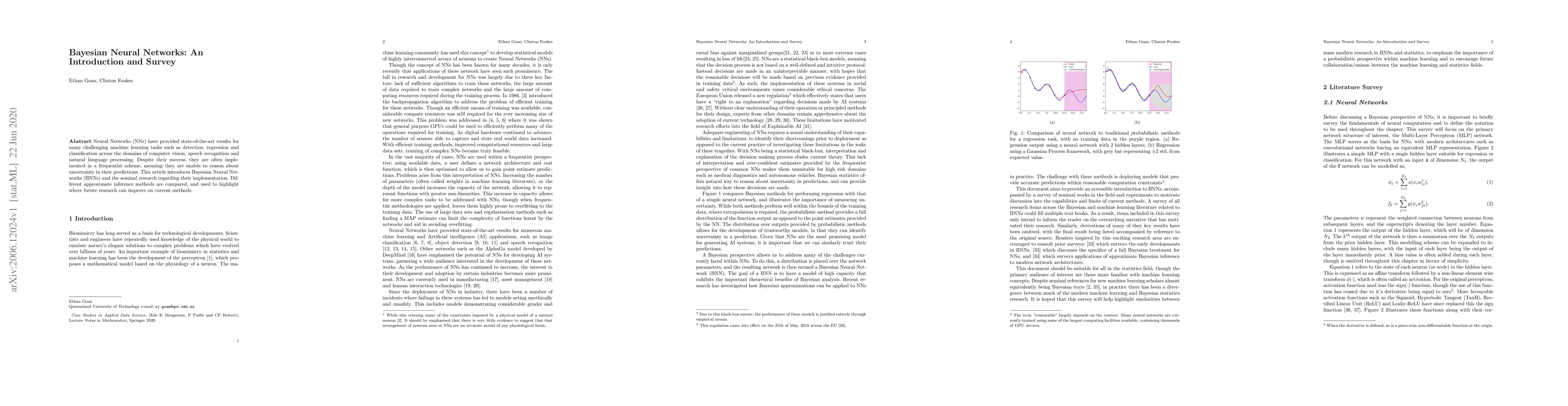 Neural Networks (NNs) have provided state-of-the-art results for many challenging machine learning tasks such as detection, regression and classification across the domains of computer vision, speech recognition and natural language processing. Despite their success, they are often implemented in a frequentist scheme, meaning they are unable to reason about uncertainty in their predictions. This article introduces Bayesian Neural Networks (BNNs) and the seminal research regarding their implementation. Different approximate inference methods are compared, and used to highlight where future research can improve on current methods.