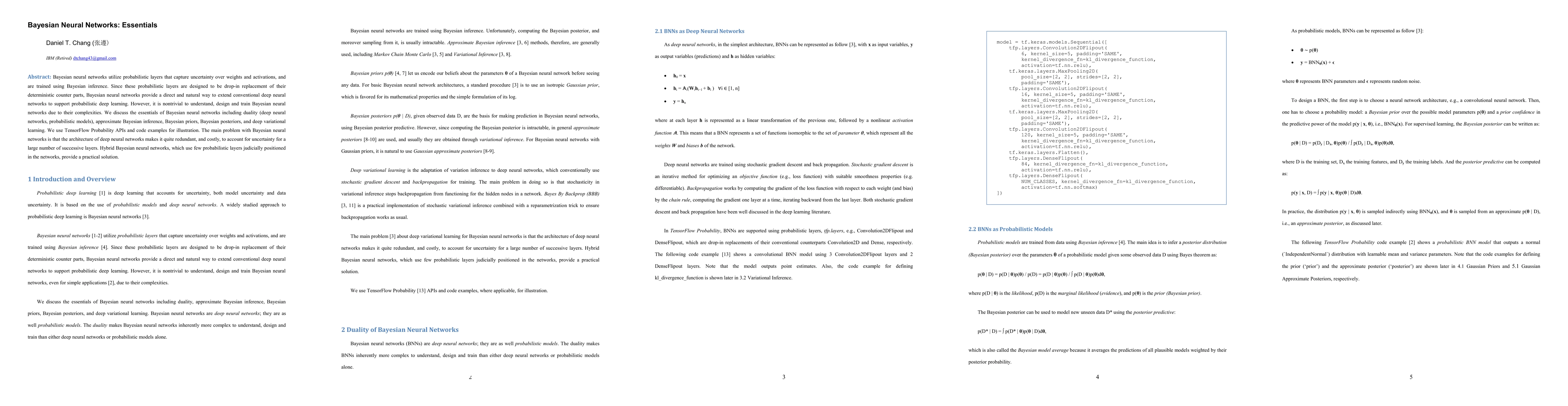 Summary: Bayesian neural networks incorporate probabilistic layers to manage uncertainty in weights and activations, trained via Bayesian inference, extending conventional deep learning. Despite complexities, essential concepts include duality, approximate inference, priors, posteriors, and deep variational learning, illustrated using TensorFlow Probability. The main challenge is redundancy and cost in uncertainty accounting across many layers, addressed by hybrid networks with strategically placed probabilistic layers.