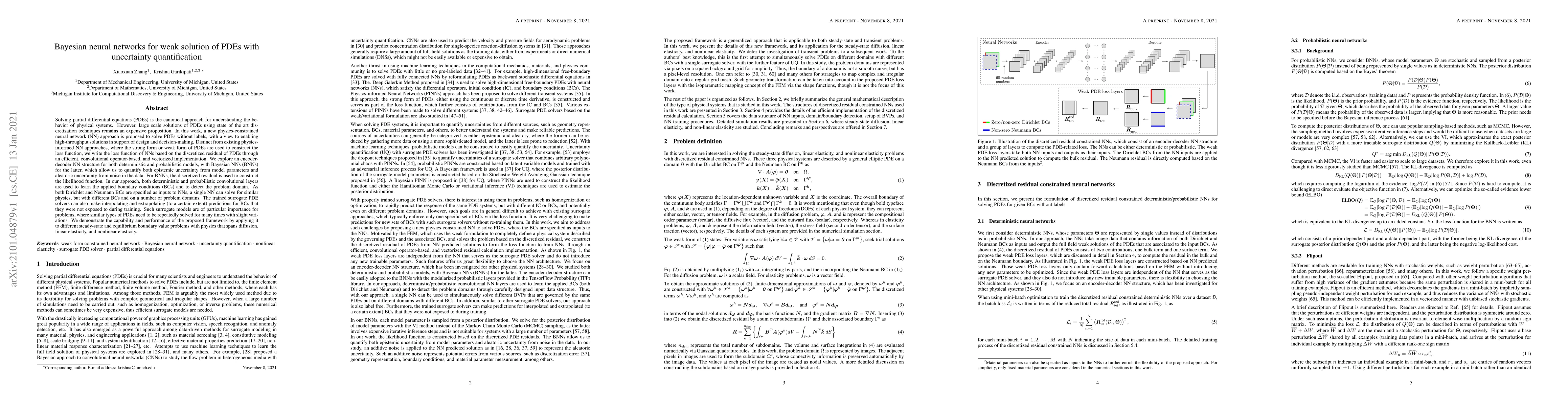 This paper proposes a physics-constrained neural network approach to solve PDEs using Bayesian neural networks (BNNs) for uncertainty quantification. The method leverages convolutional layers and an efficient implementation to handle discretized residuals, enabling high-throughput solutions for design and decision-making. BNNs are used to quantify both epistemic and aleatoric uncertainties, and the framework can interpolate and extrapolate predictions for boundary conditions not seen during training.