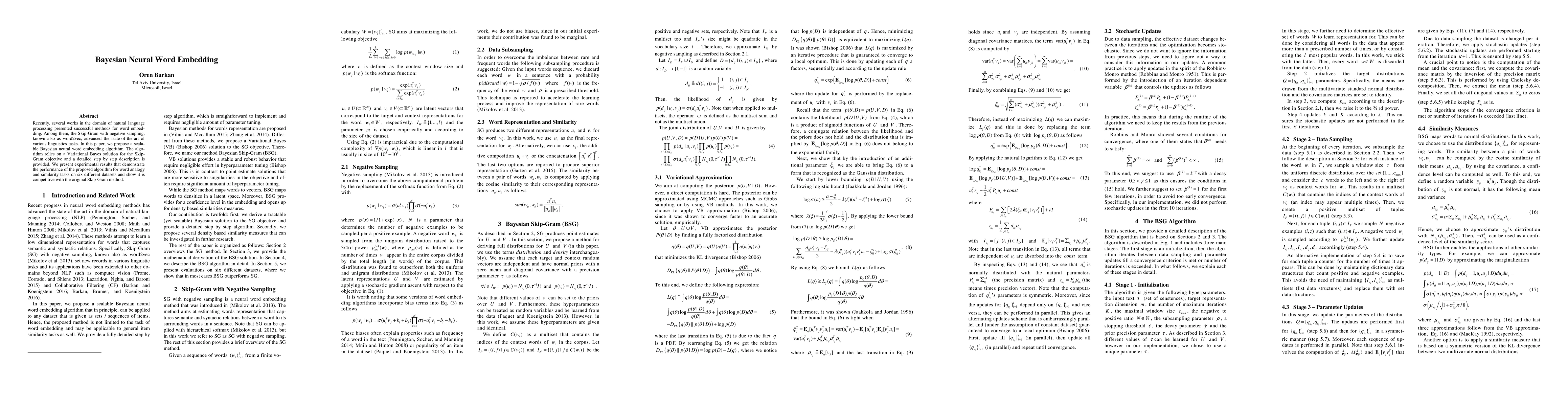 This paper introduces a scalable Bayesian neural word embedding algorithm based on a Variational Bayes solution for the Skip-Gram objective. Experimental results show its competitive performance on word analogy and similarity tasks across six datasets.