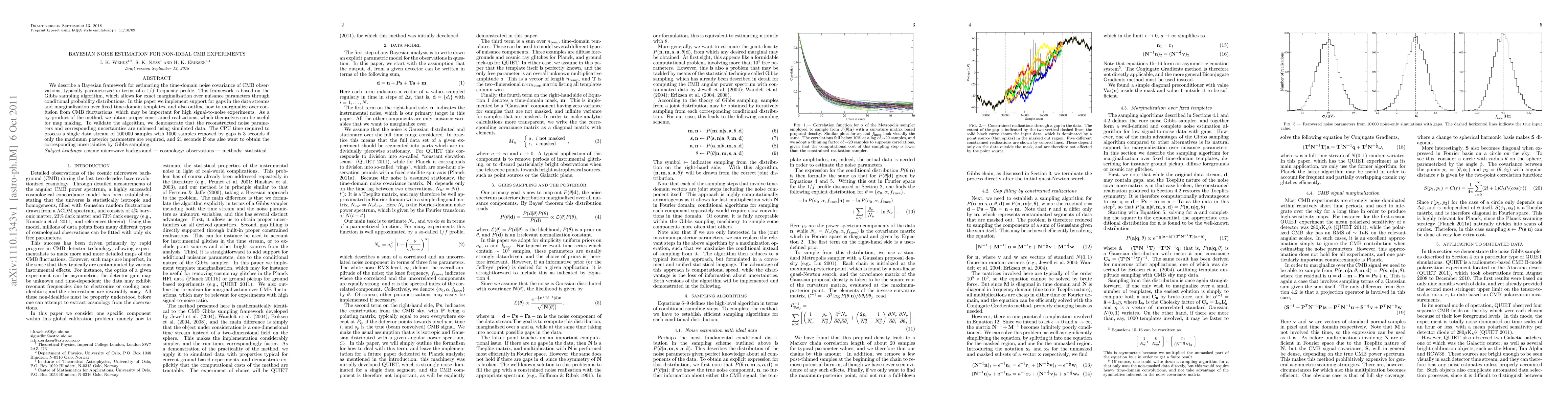 We describe a Bayesian framework for estimating the time-domain noise covariance of CMB observations, typically parametrized in terms of a 1/f frequency profile. This framework is based on the Gibbs sampling algorithm, which allows for exact marginalization over nuisance parameters through conditional probability distributions. In this paper we implement support for gaps in the data streams and marginalization over fixed time-domain templates, and also outline how to marginalize over confusion from CMB fluctuations, which may be important for high signal-to-noise experiments. As a by-product of the method, we obtain proper constrained realizations, which themselves can be useful for map making. To validate the algorithm, we demonstrate that the reconstructed noise parameters and corresponding uncertainties are unbiased using simulated data. The CPU time required to process a single data stream of 100 000 samples with 1000 samples removed by gaps is 3 seconds if only the maximum posterior parameters are required, and 21 seconds if one also want to obtain the corresponding uncertainties by Gibbs sampling.