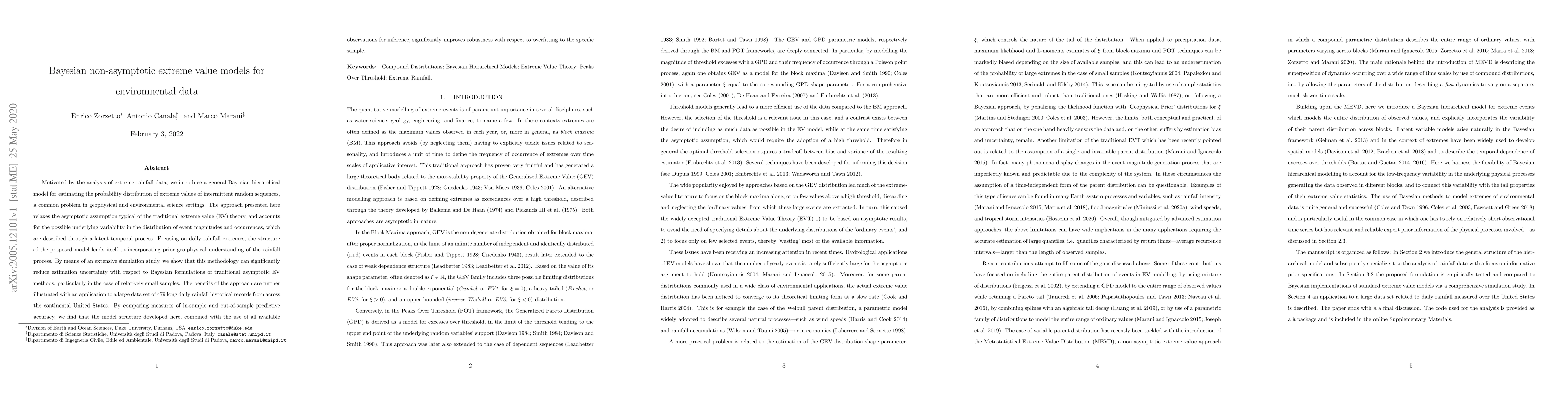 Motivated by the analysis of extreme rainfall data, we introduce a general Bayesian hierarchical model for estimating the probability distribution of extreme values of intermittent random sequences, a common problem in geophysical and environmental science settings. The approach presented here relaxes the asymptotic assumption typical of the traditional extreme value (EV) theory, and accounts for the possible underlying variability in the distribution of event magnitudes and occurrences, which are described through a latent temporal process. Focusing on daily rainfall extremes, the structure of the proposed model lends itself to incorporating prior geo-physical understanding of the rainfall process. By means of an extensive simulation study, we show that this methodology can significantly reduce estimation uncertainty with respect to Bayesian formulations of traditional asymptotic EV methods, particularly in the case of relatively small samples. The benefits of the approach are further illustrated with an application to a large data set of 479 long daily rainfall historical records from across the continental United States. By comparing measures of in-sample and out-of-sample predictive accuracy, we find that the model structure developed here, combined with the use of all available observations for inference, significantly improves robustness with respect to overfitting to the specific sample.