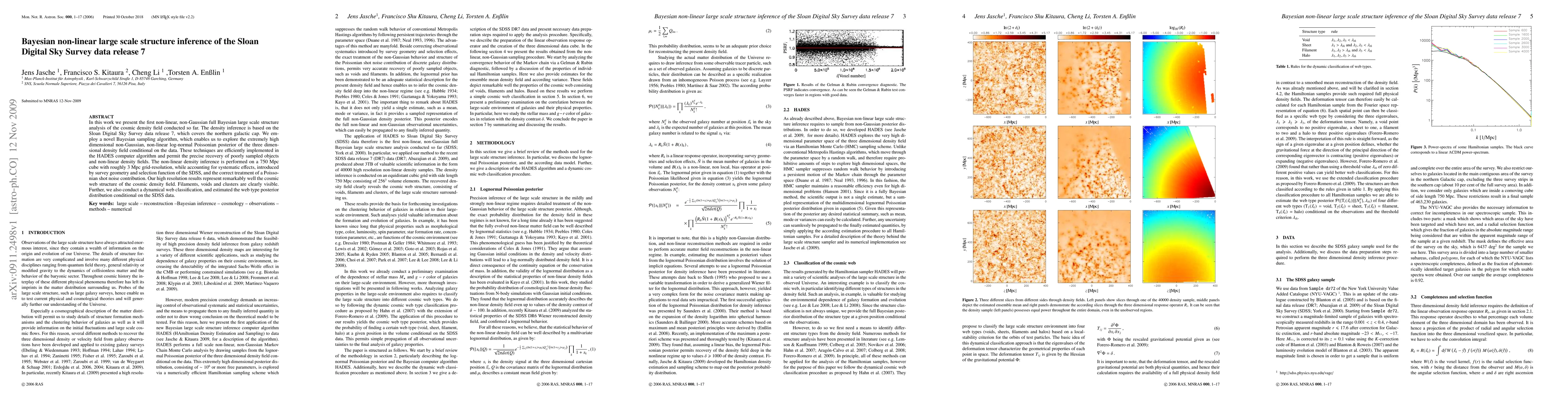 In this work we present the first non-linear, non-Gaussian full Bayesian large scale structure analysis of the cosmic density field conducted so far. The density inference is based on the Sloan Digital Sky Survey data release 7, which covers the northern galactic cap. We employ a novel Bayesian sampling algorithm, which enables us to explore the extremely high dimensional non-Gaussian, non-linear log-normal Poissonian posterior of the three dimensional density field conditional on the data. These techniques are efficiently implemented in the HADES computer algorithm and permit the precise recovery of poorly sampled objects and non-linear density fields. The non-linear density inference is performed on a 750 Mpc cube with roughly 3 Mpc grid-resolution, while accounting for systematic effects, introduced by survey geometry and selection function of the SDSS, and the correct treatment of a Poissonian shot noise contribution. Our high resolution results represent remarkably well the cosmic web structure of the cosmic density field. Filaments, voids and clusters are clearly visible. Further, we also conduct a dynamical web classification, and estimated the web type posterior distribution conditional on the SDSS data.