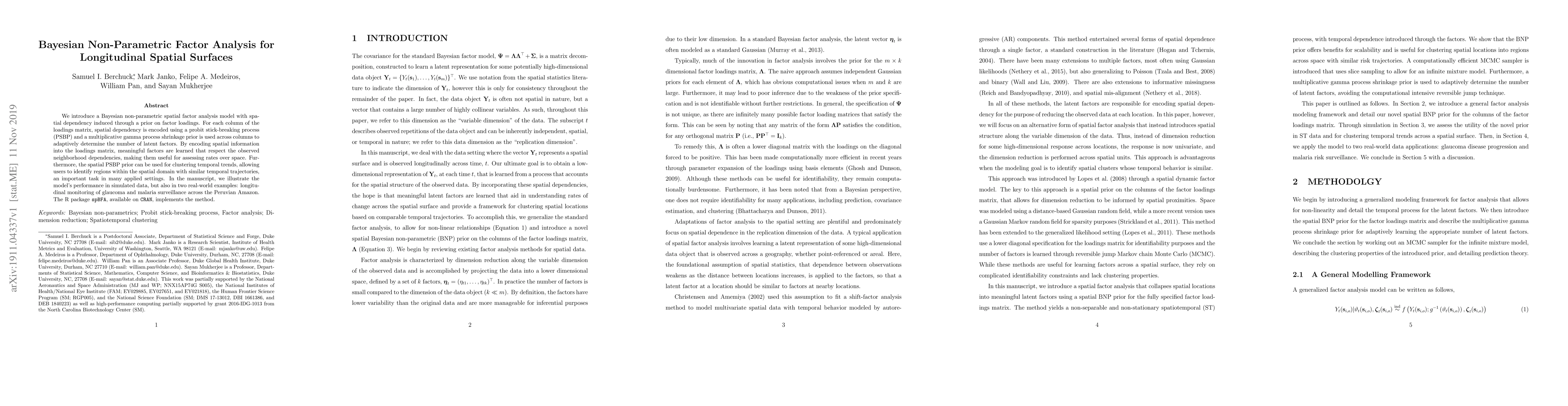 This paper proposes a Bayesian non-parametric spatial factor analysis model that incorporates spatial dependency through a probit stick-breaking process and adaptively determines latent factors. The method is demonstrated to effectively identify regions with similar temporal trends in simulated and real-world data, including glaucoma monitoring and malaria surveillance.