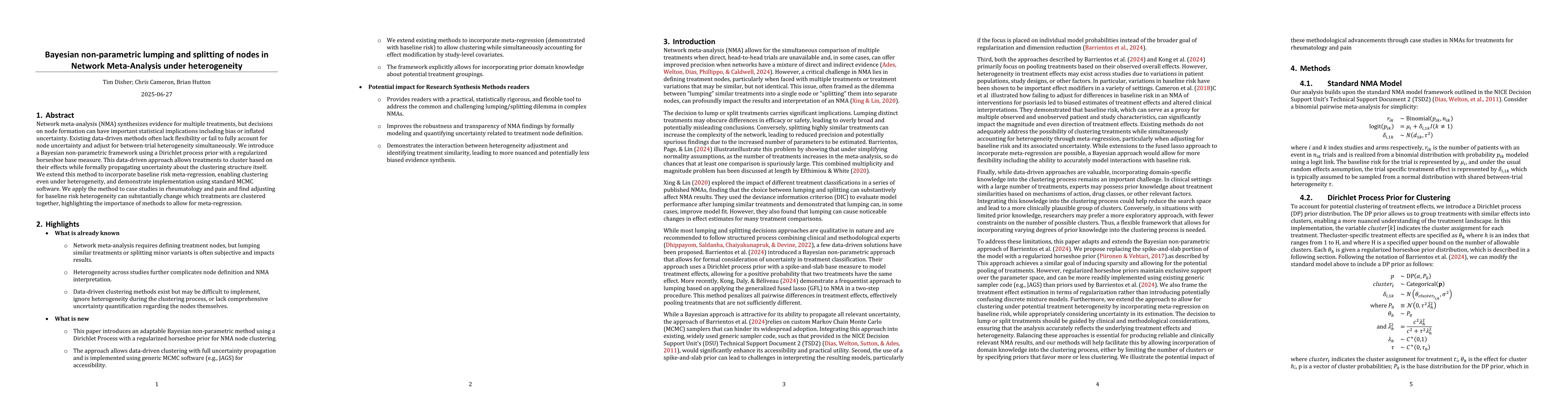 Network meta-analysis (NMA) synthesizes evidence for multiple treatments, but decisions on node formation can have important statistical implications including bias or inflated uncertainty. Existing data-driven methods often lack flexibility or fail to fully account for node uncertainty and adjust for between-trial heterogeneity simultaneously. We introduce a Bayesian non-parametric framework using a Dirichlet process prior with a regularized horseshoe base measure. This data-driven approach allows treatments to cluster based on their effects while formally propagating uncertainty about the clustering structure itself. We extend this method to incorporate baseline risk meta-regression, enabling clustering even under heterogeneity, and demonstrate implementation using standard MCMC software. We apply the method to case studies in rheumatology and pain and find adjusting for baseline risk heterogeneity can substantially change which treatments are clustered together, highlighting the importance of methods to allow for meta-regression.
