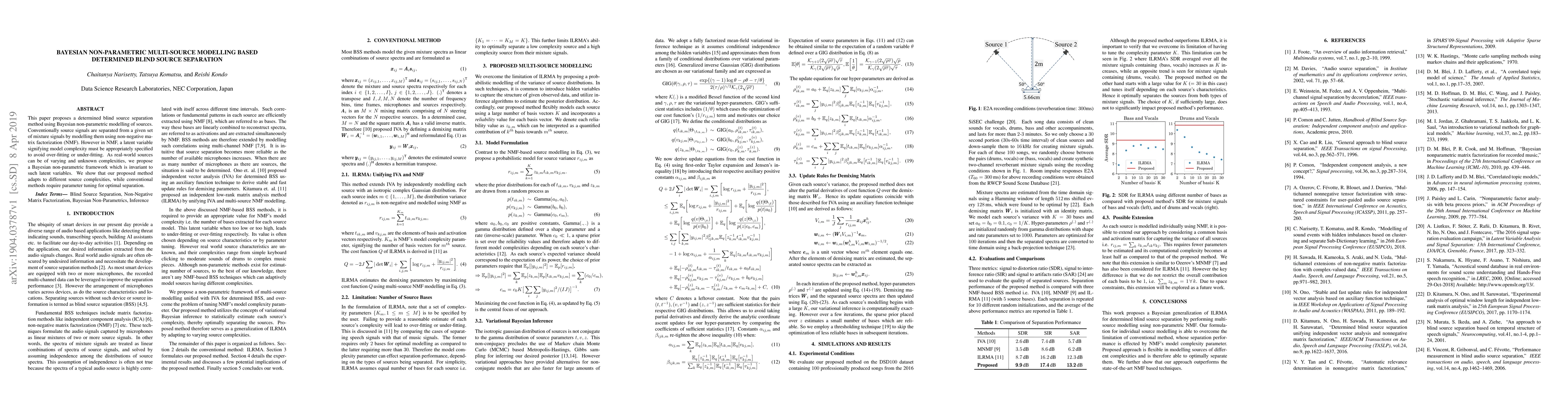 This paper introduces a determined blind source separation method using Bayesian non-parametric modelling, which adapts to varying and unknown source complexities without requiring latent variable specification. The proposed method outperforms conventional non-negative matrix factorization approaches that necessitate parameter tuning.