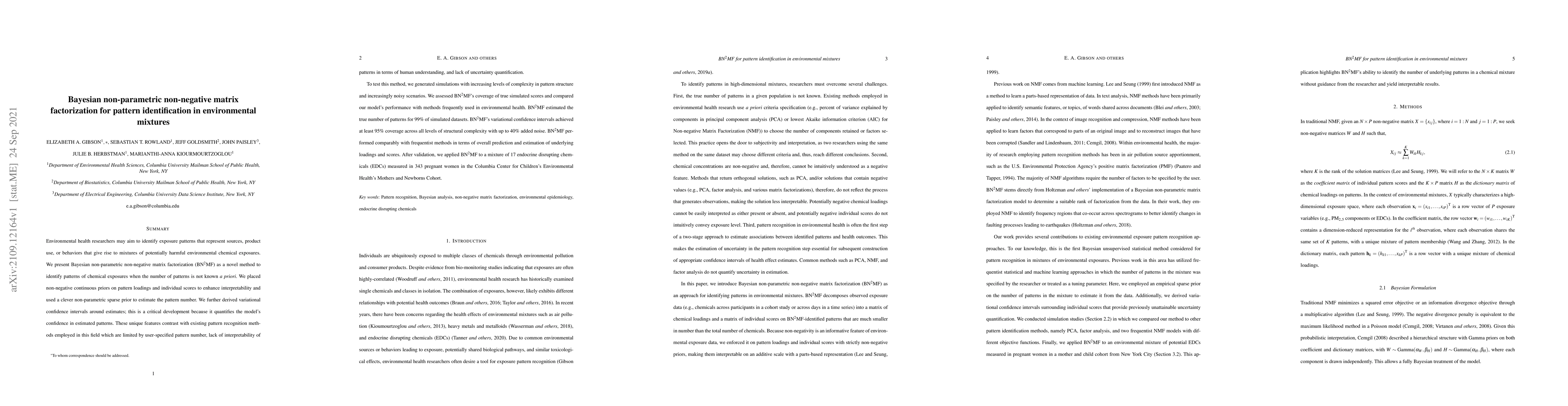Environmental health researchers may aim to identify exposure patterns that represent sources, product use, or behaviors that give rise to mixtures of potentially harmful environmental chemical exposures. We present Bayesian non-parametric non-negative matrix factorization (BN^2MF) as a novel method to identify patterns of chemical exposures when the number of patterns is not known a priori. We placed non-negative continuous priors on pattern loadings and individual scores to enhance interpretability and used a clever non-parametric sparse prior to estimate the pattern number. We further derived variational confidence intervals around estimates; this is a critical development because it quantifies the model's confidence in estimated patterns. These unique features contrast with existing pattern recognition methods employed in this field which are limited by user-specified pattern number, lack of interpretability of patterns in terms of human understanding, and lack of uncertainty quantification.