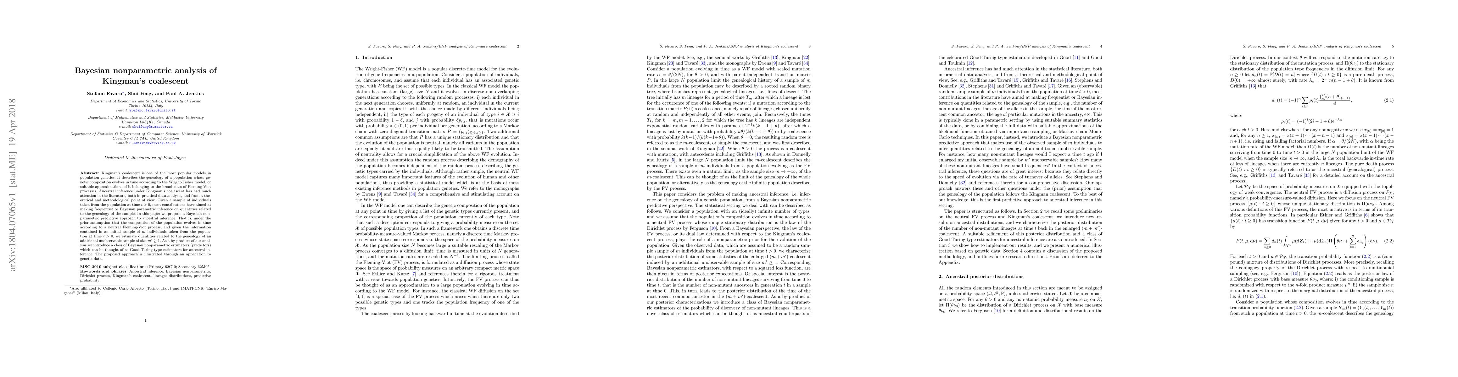 The paper establishes a Bayesian nonparametric framework for ancestral inference under Kingman's coalescent, introducing novel estimators and deriving posterior distributions for genealogical quantities.
