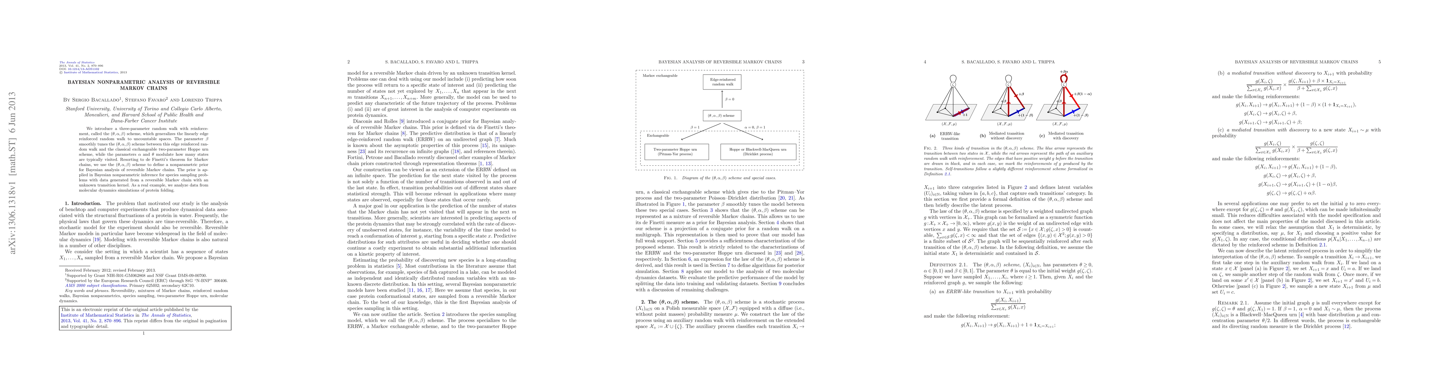 This paper introduces a three-parameter random walk scheme for Bayesian nonparametric analysis of reversible Markov chains, generalizing edge reinforcement to uncountable spaces. It applies this scheme to infer species sampling problems and analyzes protein folding data from molecular dynamics simulations.