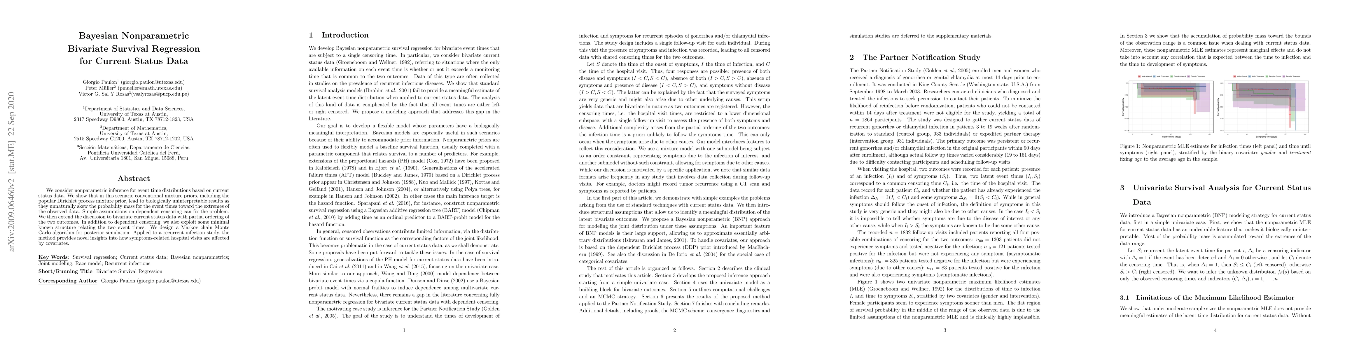 This paper proposes a Bayesian nonparametric regression method for bivariate survival analysis using current status data, addressing issues with conventional mixture priors that skew event time probabilities. It introduces dependent censoring and minimal known structure to provide biologically interpretable results, and applies a Markov chain Monte Carlo algorithm to a recurrent infection study to reveal insights on symptom-related hospital visits.