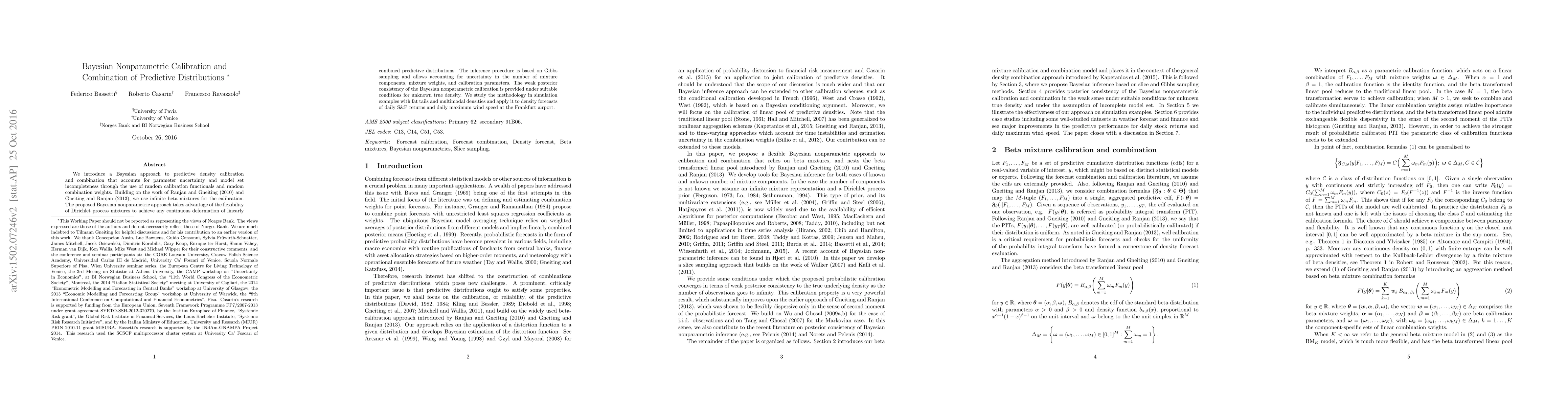 This paper proposes a Bayesian nonparametric method for calibrating and combining predictive distributions, utilizing random calibration functionals and weights to account for parameter uncertainty and model set incompleteness. The approach leverages infinite beta mixtures and Dirichlet process mixtures for flexibility, employing Gibbs sampling for inference and demonstrating its effectiveness through simulations and applications to financial and weather data.