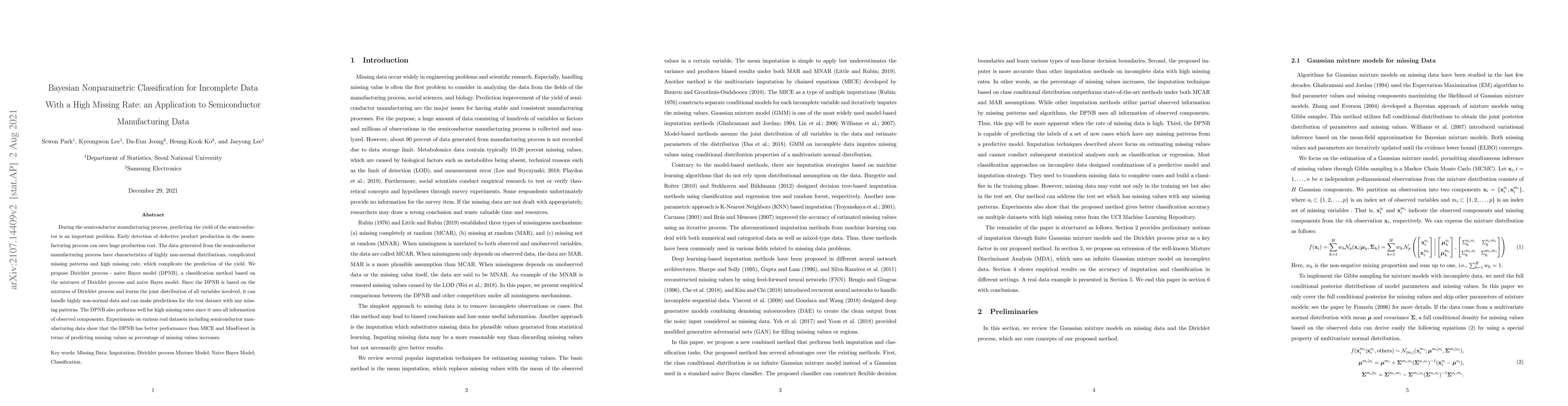 This paper proposes a Dirichlet process - naive Bayes model (DPNB) for classifying incomplete semiconductor manufacturing data with high missing rates. The DPNB effectively handles non-normal distributions and complex missing patterns, outperforming traditional methods like MICE and MissForest in predicting yield.