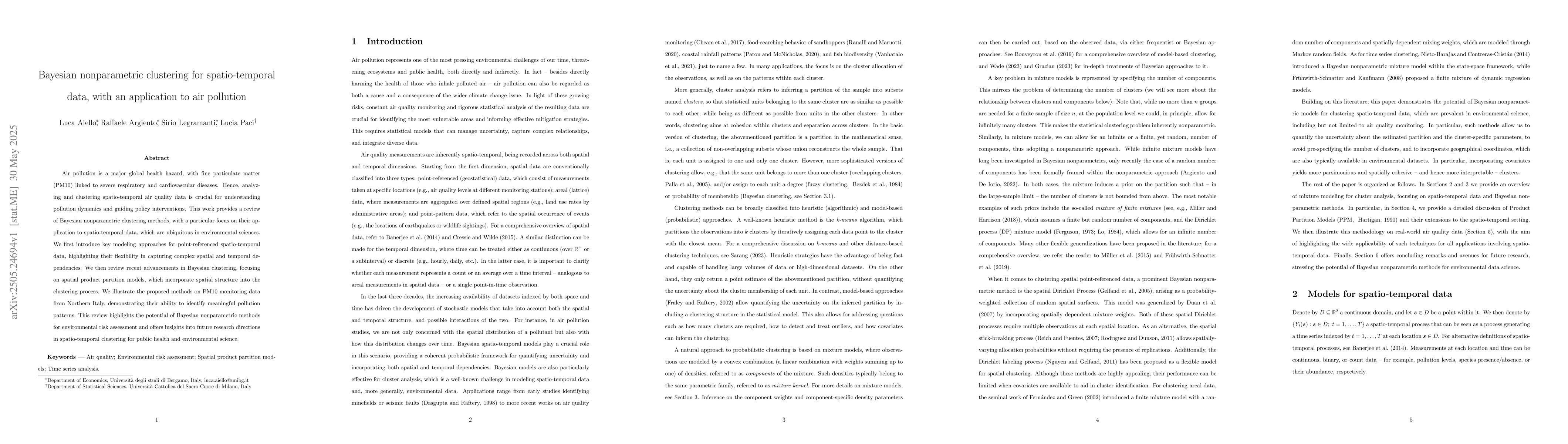 The research reviews Bayesian nonparametric clustering methods, focusing on spatial product partition models for spatio-temporal data, specifically applied to PM10 monitoring data from Northern Italy.