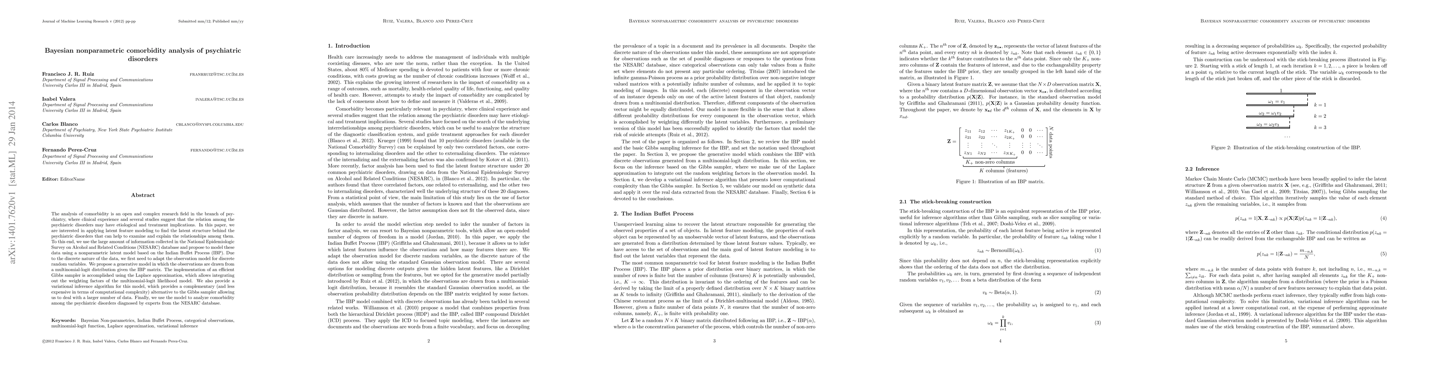 This paper applies Bayesian nonparametric latent feature modeling to analyze comorbidity among psychiatric disorders using the NESARC database. It employs the Indian Buffet Process with a multinomial-logit observation model and uses both Gibbs sampling and variational inference for efficient computation to uncover underlying relationships among disorders.