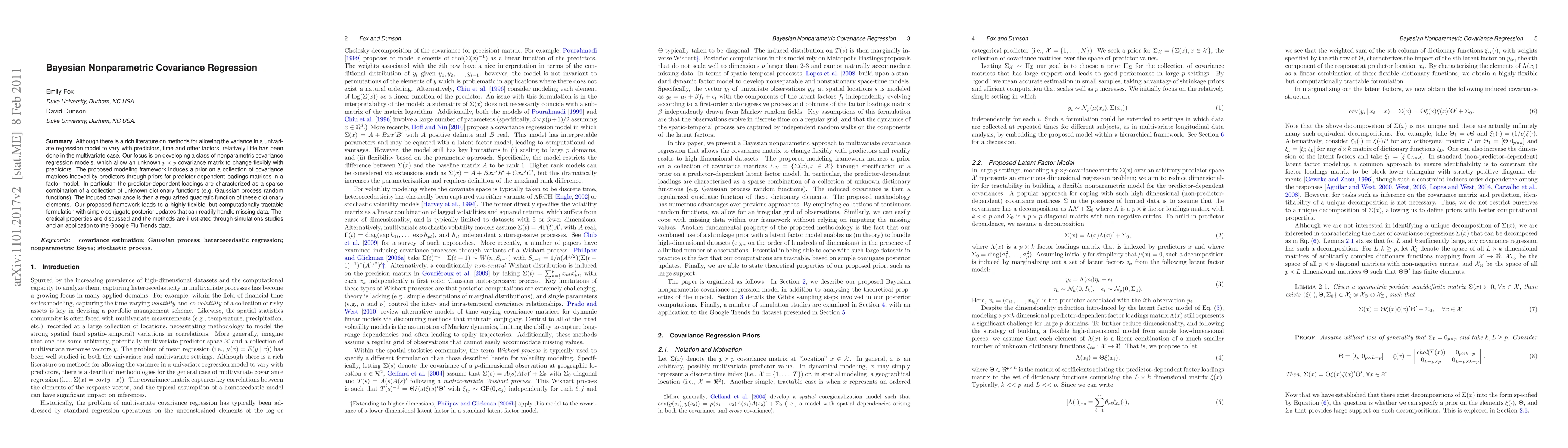 This paper develops a Bayesian nonparametric covariance regression framework to flexibly model an unknown p x p covariance matrix that varies with predictors. The approach uses a sparse combination of dictionary functions to induce a prior on covariance matrices, enabling a computationally tractable solution with conjugate posterior updates. The method is demonstrated through simulations and an application to Google Flu Trends data.