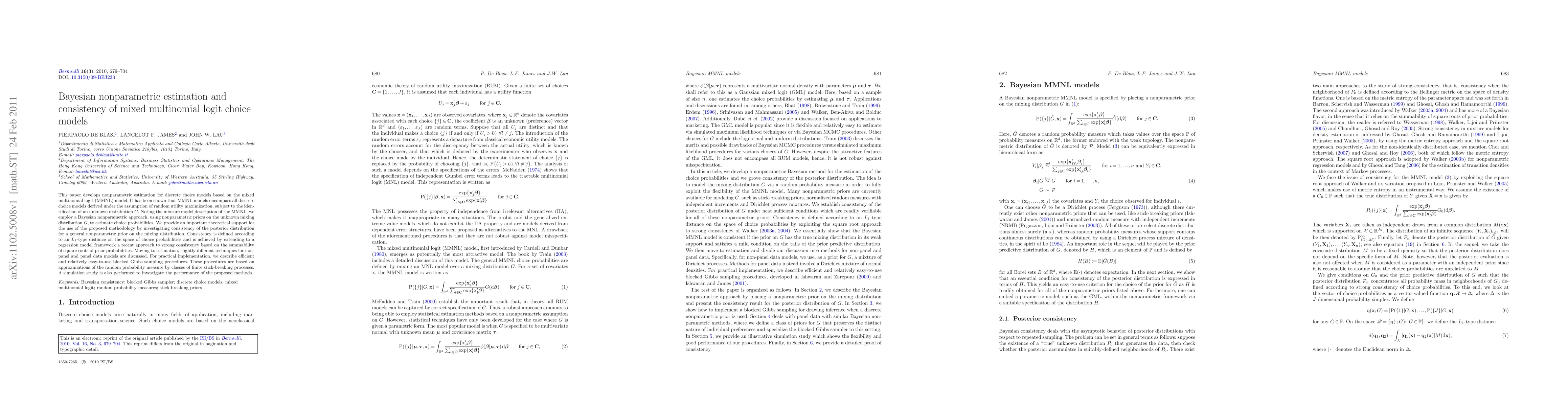 This paper develops Bayesian nonparametric estimation for mixed multinomial logit (MMNL) choice models, employing a Bayesian approach to estimate choice probabilities and proving consistency of the posterior distribution. It also presents blocked Gibbs sampling procedures for practical implementation and evaluates the method's performance through a simulation study.