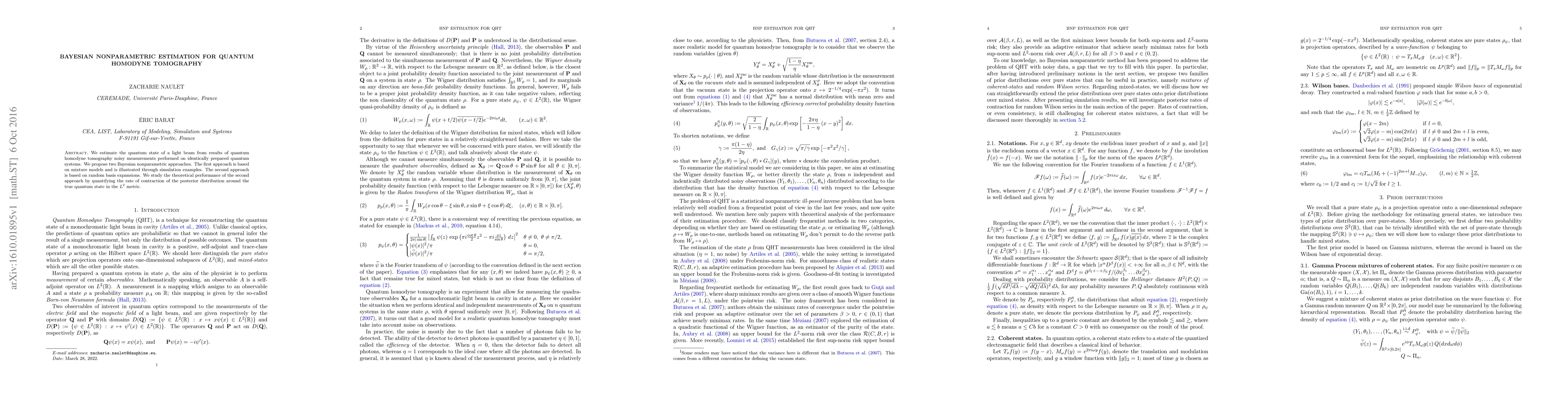 This paper proposes two Bayesian nonparametric methods for estimating the quantum state of a light beam from noisy homodyne tomography measurements. The first method uses mixture models, while the second employs random basis expansions, with theoretical analysis focusing on the contraction rate of the posterior distribution in the $L^2$ metric.