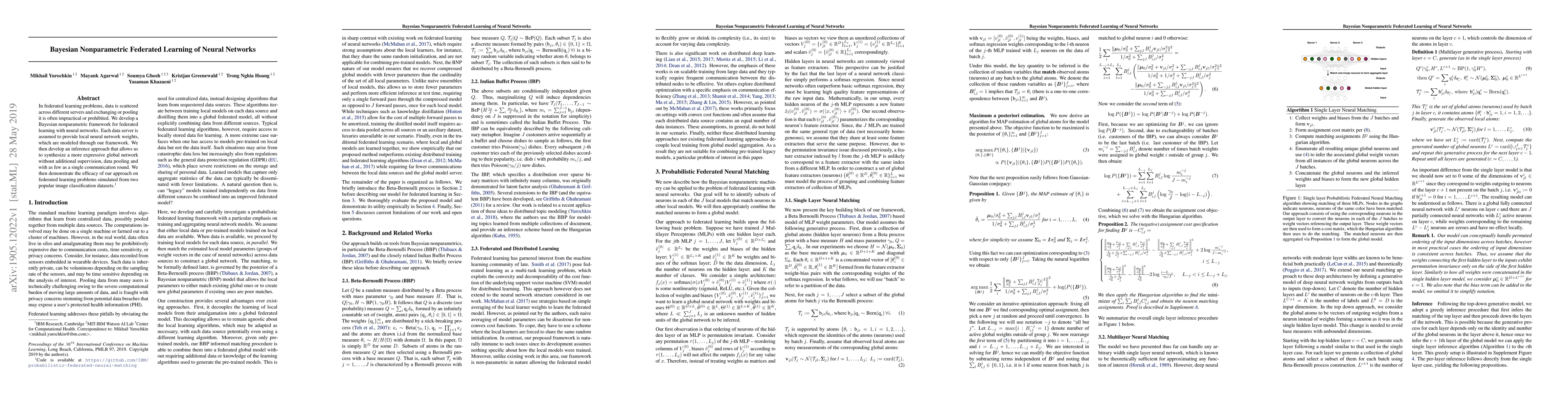 This paper proposes a Bayesian nonparametric framework for federated learning, enabling the synthesis of a global neural network from local weights without data pooling or additional supervision, using a single communication round. The method is demonstrated to be effective on federated learning tasks from two image classification datasets.
