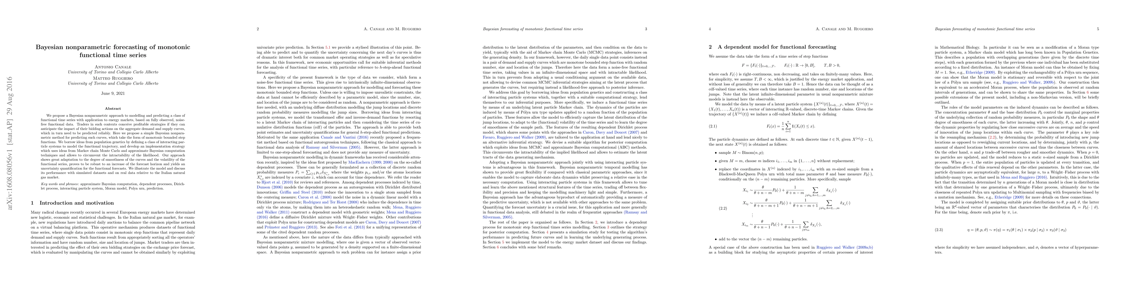 This paper introduces a Bayesian nonparametric method for forecasting monotonic functional time series, particularly useful in energy markets. The approach leverages interacting particle systems and Markov chain Monte Carlo techniques to model and predict monotonic bounded step functions, demonstrating robustness and adaptability to volatility and forecast horizon.