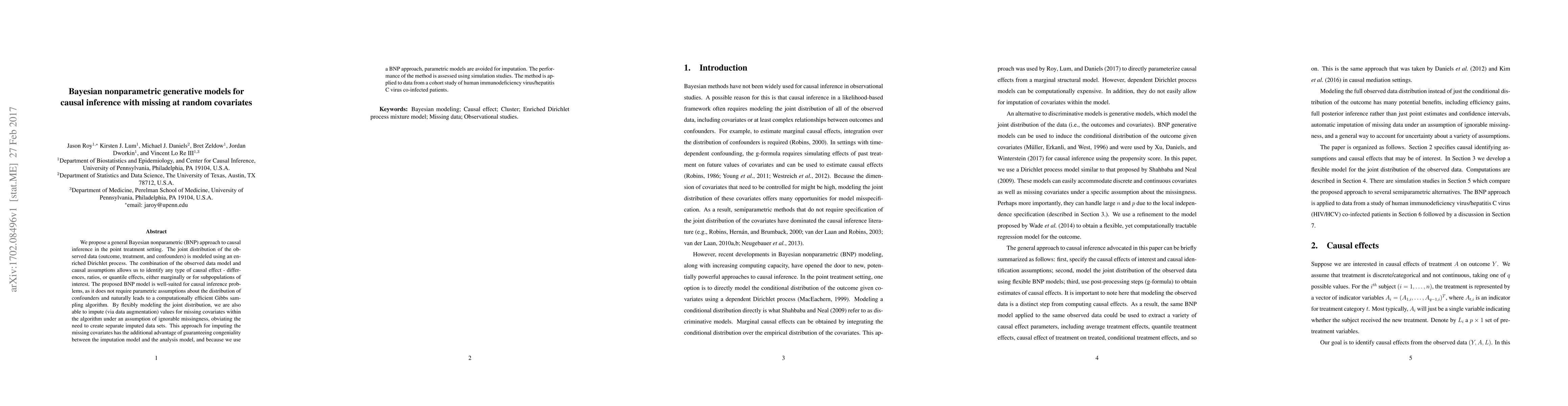 This paper proposes a Bayesian nonparametric generative model for causal inference in settings with missing at random covariates, using an enriched Dirichlet process to model the joint distribution of observed data. The method identifies various causal effects and efficiently handles missing data through data augmentation, avoiding the need for parametric imputation models.